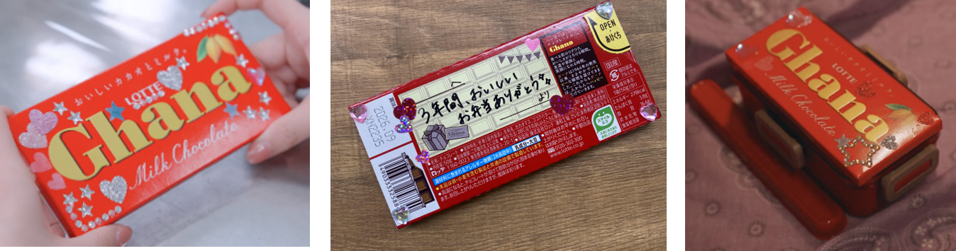 『#ラス弁返しガーナ』:学生生活最後のお弁当をきっかけに、これまでお弁当を作ってくれた方に感謝の気持ちを伝えることを「ガーナ」がお手伝いします。照れくさくて、うまく伝えきれていない、「ありがとう」の気持ちを、「ガーナ」の板チョコレートのパッケージ裏面にあるメッセージ欄を活用して、気軽に気持ちを届ける新しいコミュニケーションを提案します。まっすぐに想いを綴ったり、パッケージをデコレーションをするなど、それぞれの形で「ガーナ」に気持ちをのせて、学生生活最後のお弁当の時間を、感謝を伝える特別な瞬間に変換。かけがえのないひと時を甘く彩ります。