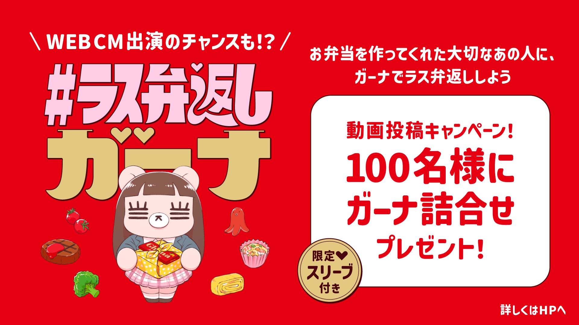 「#ラス弁返しガーナ動画投稿キャンペーン」を本日2月18日(水)10時より開始します。参加いただいた方の中から抽選で100名様に、「コレサワさんコラボデザインの限定スリーブつき!ガーナ詰合せ」をプレゼントします。また、特典として、ご投稿いただいた動画の中から選ばれた一部映像(最大39作品)は、「ガーナ」×コレサワさん『最後のべんとう』のWEB CMとして採用され、WEB CMに出演できます。感謝の気持ちを繋いだスペシャルムービーとして、2026年3月下旬頃に公開予定です。