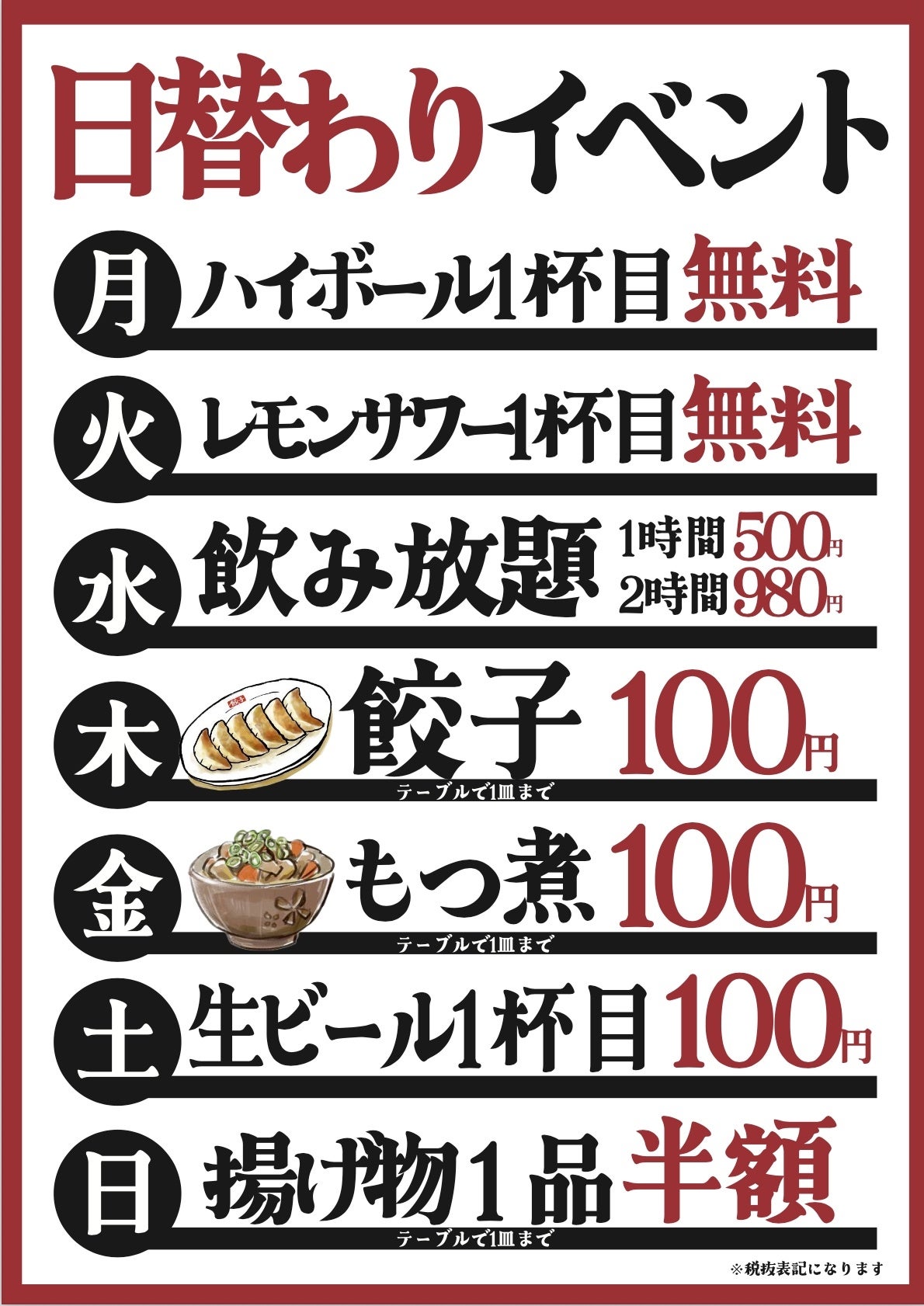 毎日曜日別で激安イベント!
