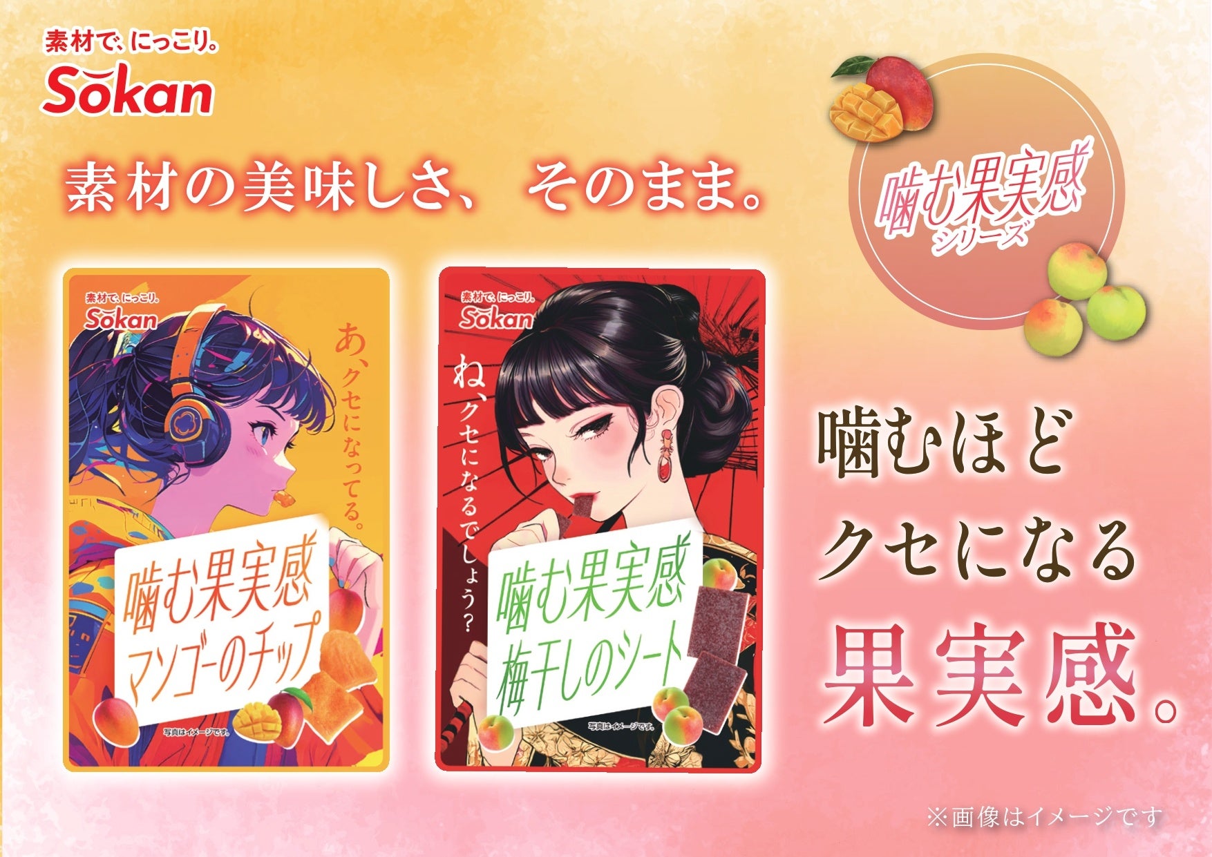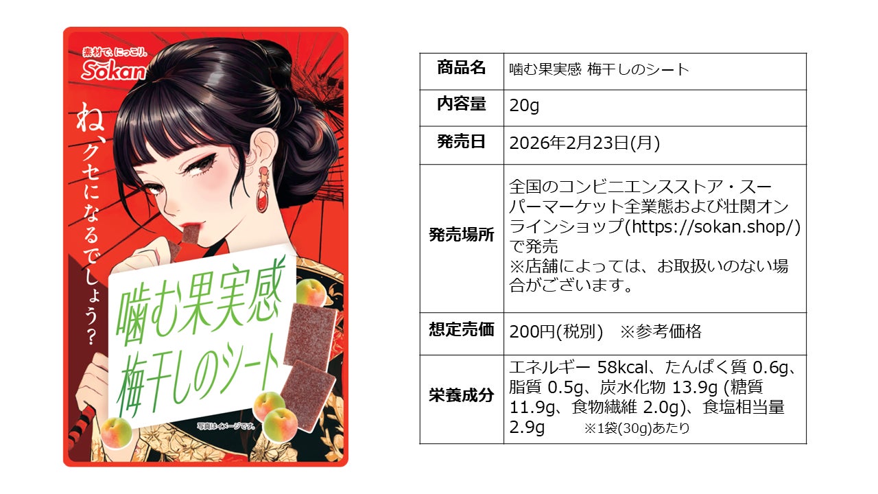 株式会社壮関(本社:栃木県矢板市 代表取締役社長:板山 健一)は、新商品『噛む果実感 マンゴーのチップ/梅干しのシート』を2026年2月23日(月)より全国のコンビニエンスストア・スーパーマーケット全業態および壮関オンラインショップ(https://sokan.shop/)で発売いたします。