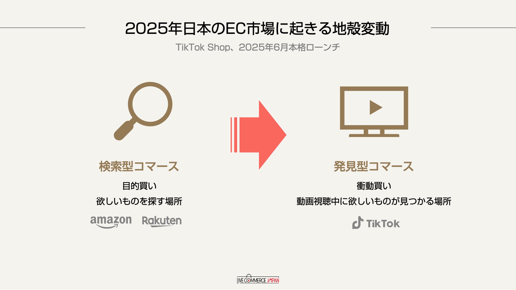 従来のEC市場における「検索」起点の購買行動は、価格競争に陥りやすく、商品の差別化が困難な状況を迎えています。一方でTikTok Shopは、動画を見てその場で欲しくなる「発見 × 衝動買い」という新しい購買体験を提供し、顕在化していない新規需要を強力に創出することが可能です。