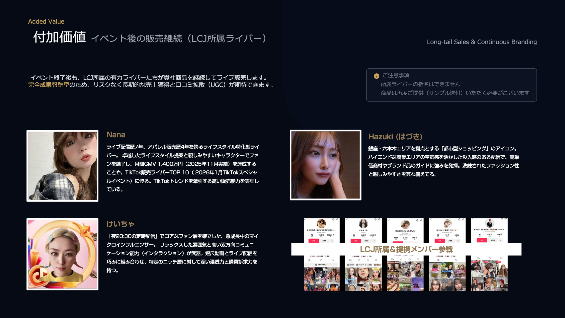 ロングテール販売: イベント終了後は、LCJ所属の有力ライバー(Nana、Hazuki、けいちゃ等)が継続して商品をライブ販売する体制を整えています。