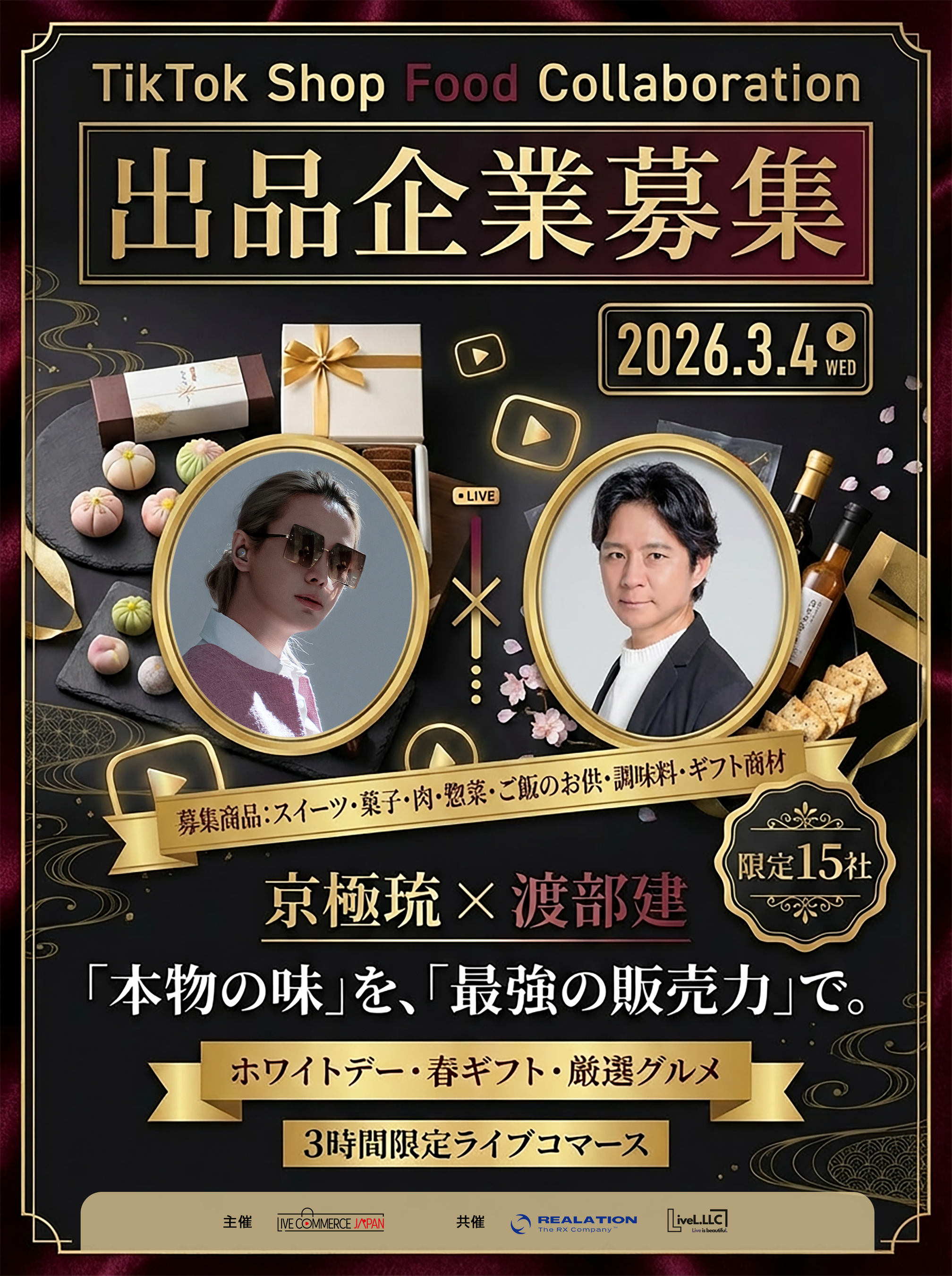 本イベントは、日本No.1クリエイター「京極琉」と、芸能界屈指の食通「渡部建」が初タッグを組み、厳選された「本物の味」をライブ配信で販売するものです。現在、限定15社の枠に対し多数の応募をいただいておりますが、開催に向け残りわずかの追加募集を開始いたしました。