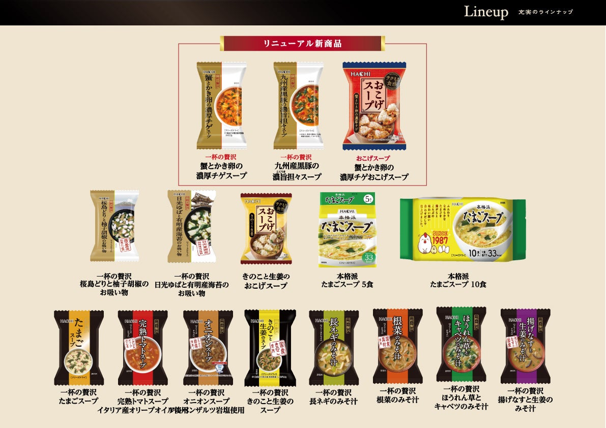 ハチ食品株式会社(大阪府大阪市、代表取締役社長:高橋 慎一、以下 ハチ食品)は、これまでご好評いただいてきた 「一杯の贅沢 海鮮チゲスープ」 「一杯の贅沢 黒豚担々スープ」および 「海鮮チゲのおこげスープ」 を進化させ、新商品『蟹とかき卵の濃厚チゲスープ』 『一杯の贅沢 九州産黒豚の濃旨担々スープ』『蟹とかき卵の濃厚チゲおこげスープ』として2026年3月2日(月)に発売いたします。