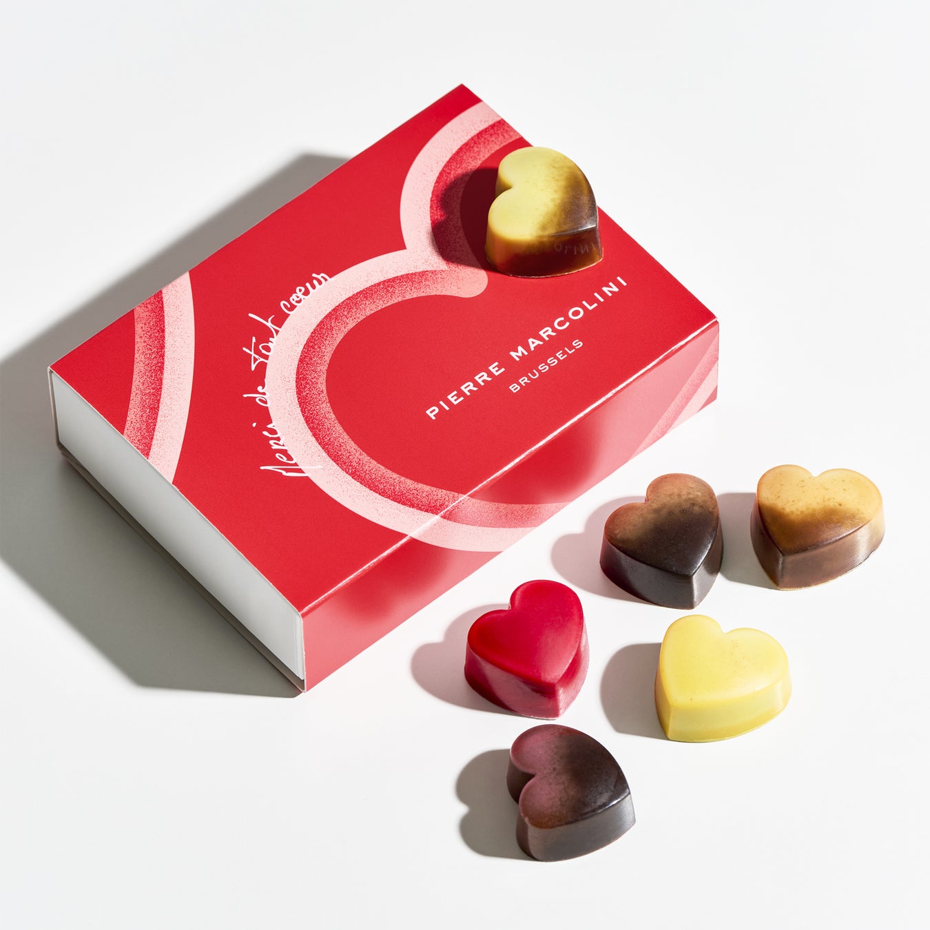 可愛いハート型のパッケージに、日本の柑橘を使った新フレーバー「クール ココロ アグリュム キャラメル」やゴロゴロとしたナッツの食感が楽しめる「プラリネ ピスターシュ」、定番人気の「プティ ビズー」など5種の詰め合わせ。