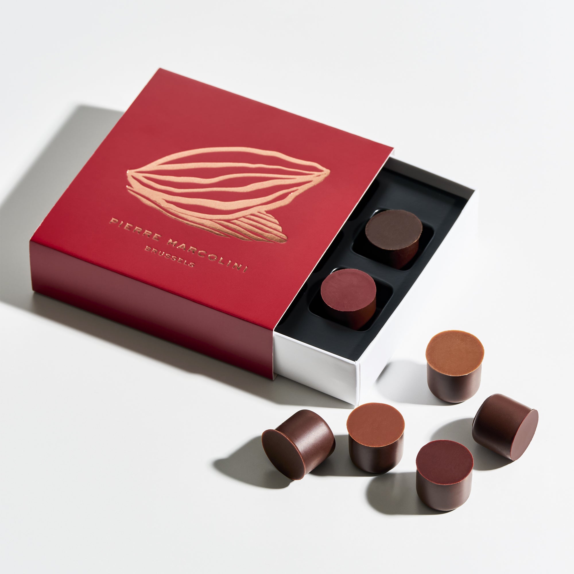 マダガスカル、ベル―、インド、サントメ、キューバなど、ピエール マルコリーニが自らの足で現地に赴き厳選したこだわりのカカオを使用。世界を旅する気分で、カカオ生産地ごとの違いを体感していただける6種7個入りのアソートメント。