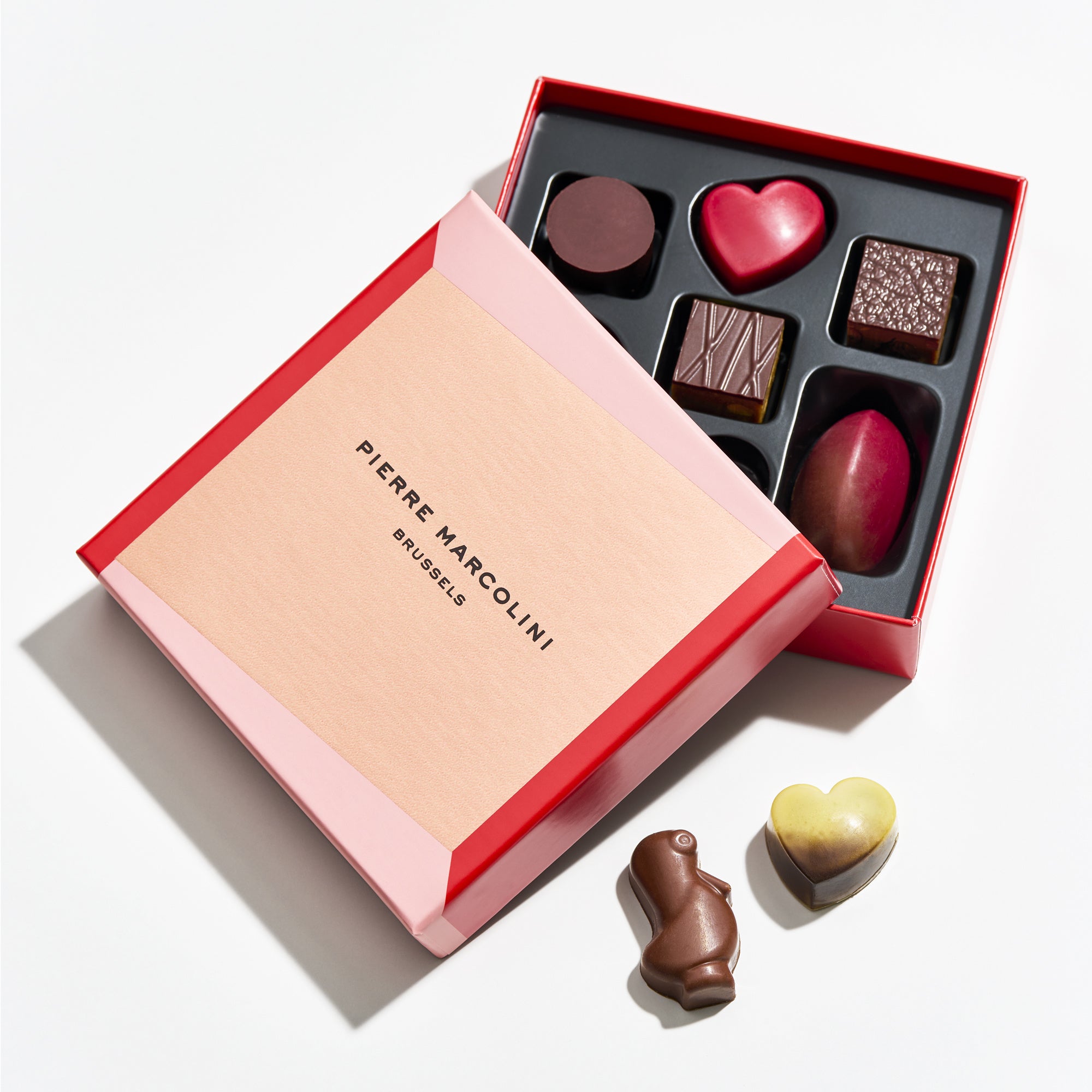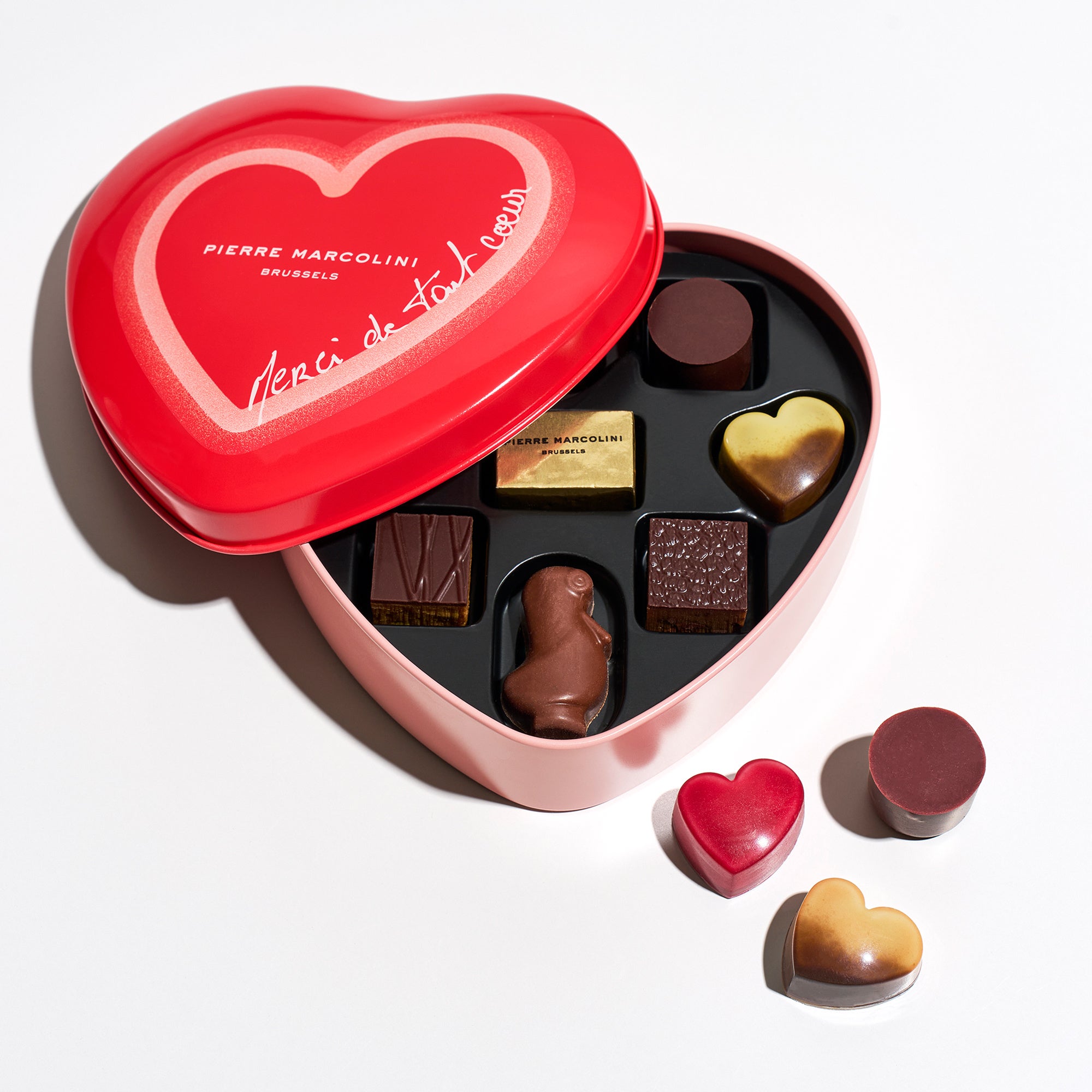 可愛いハート型のパッケージに、日本の柑橘を使った新フレーバー「クール ココロ アグリュム キャラメル」やゴロゴロとしたナッツの食感が楽しめる「プラリネ ピスターシュ」、定番人気の「プティ ビズー」など9種の詰め合わせ。