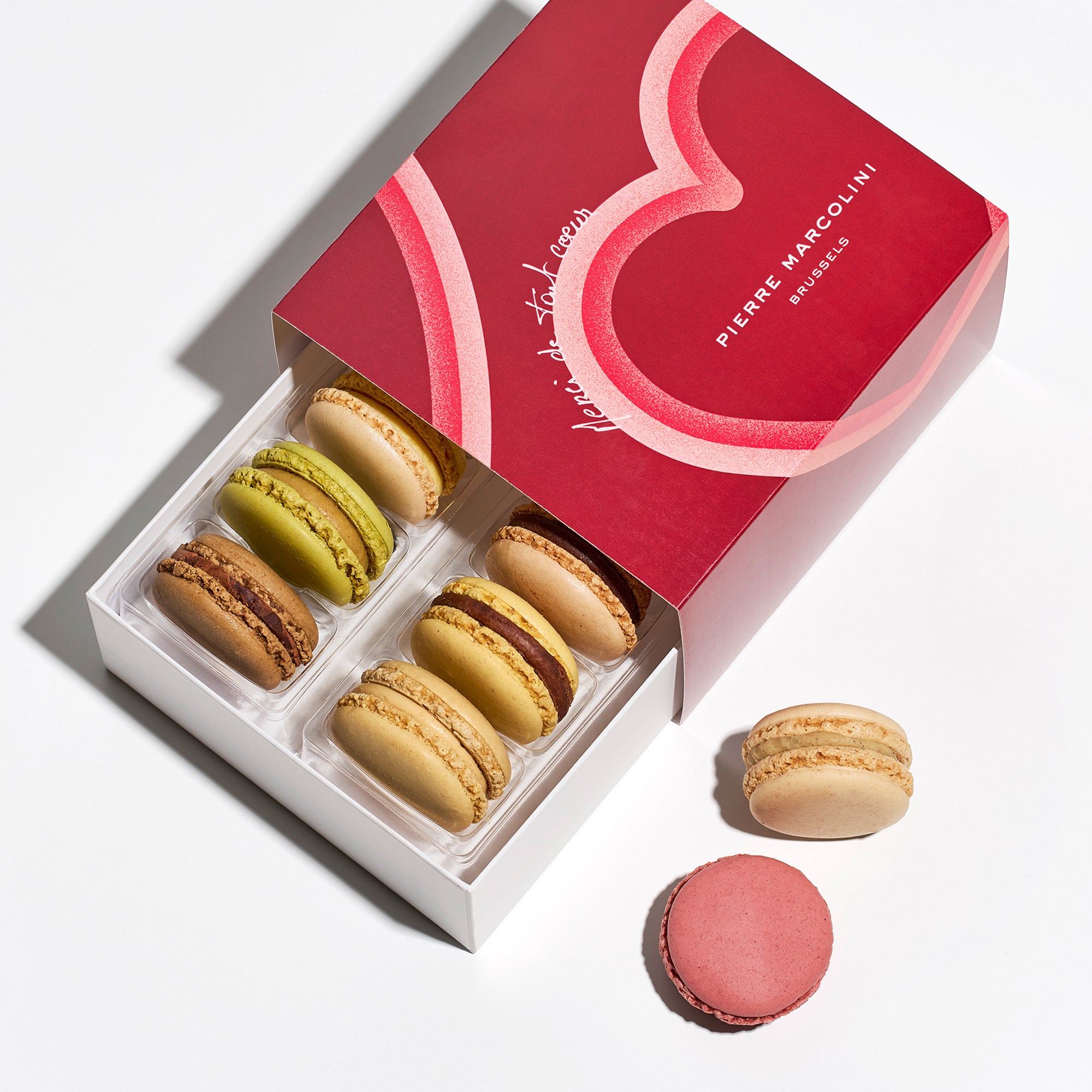 ヨーロッパの伝統菓子に、ピエール マルコリーニのセンスとこだわりを掛け合わせて完成されたマカロンを、今年のホワイトデーコレクションのテーマ「Merci de tout Cœur 」のモチーフが施されたパッケージに8種詰め合わせました。サクサクした生地の歯応え、滑らかなガナッシュやクリームの風味をお楽しみください。