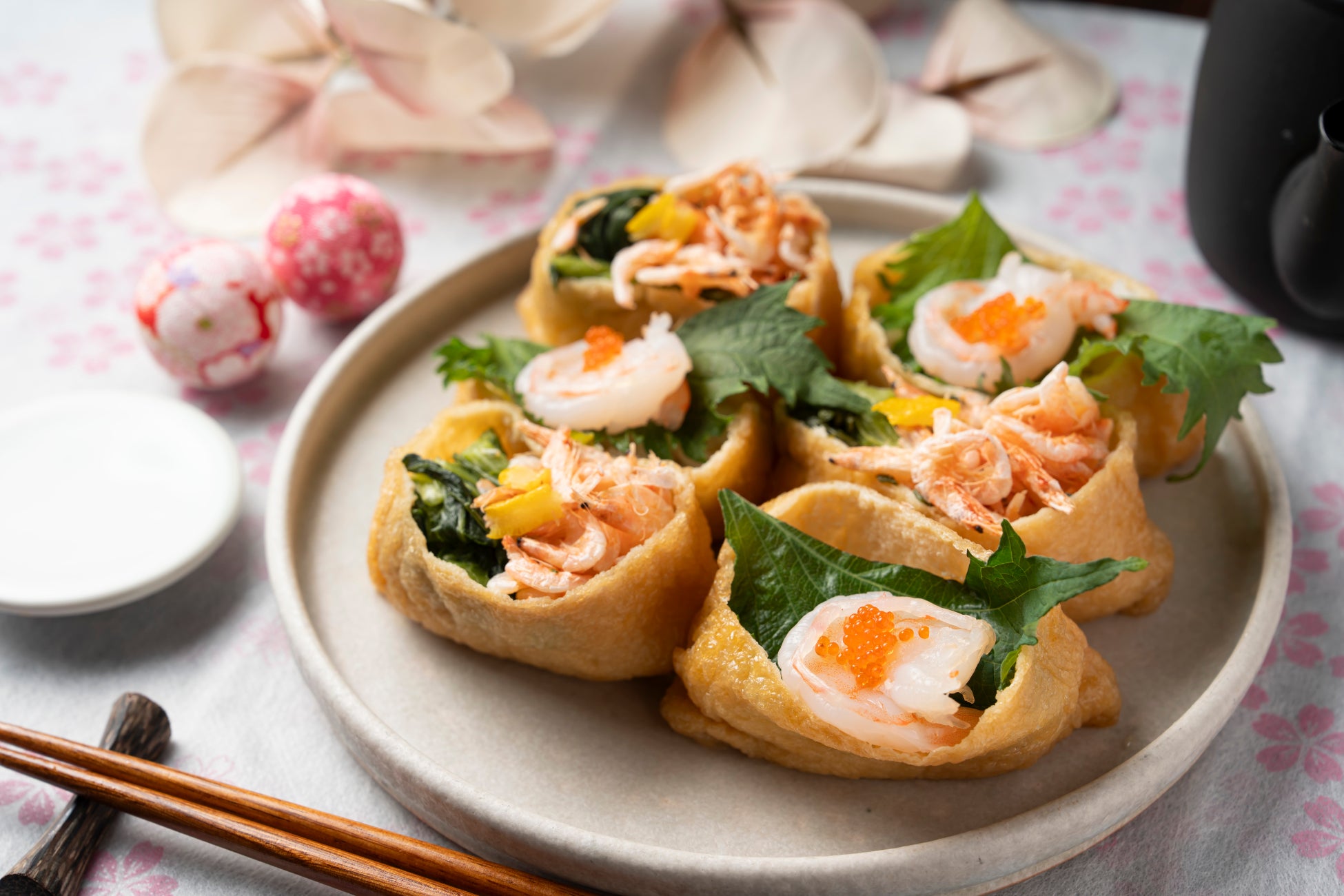 海老の弾む食感と旨みに、菜の花のほろ苦さを合わせた春季限定のいなりです。大葉の爽やかさと桜エビの香ばしさを重ね、柚子胡椒が全体の味わいを引き締めます。