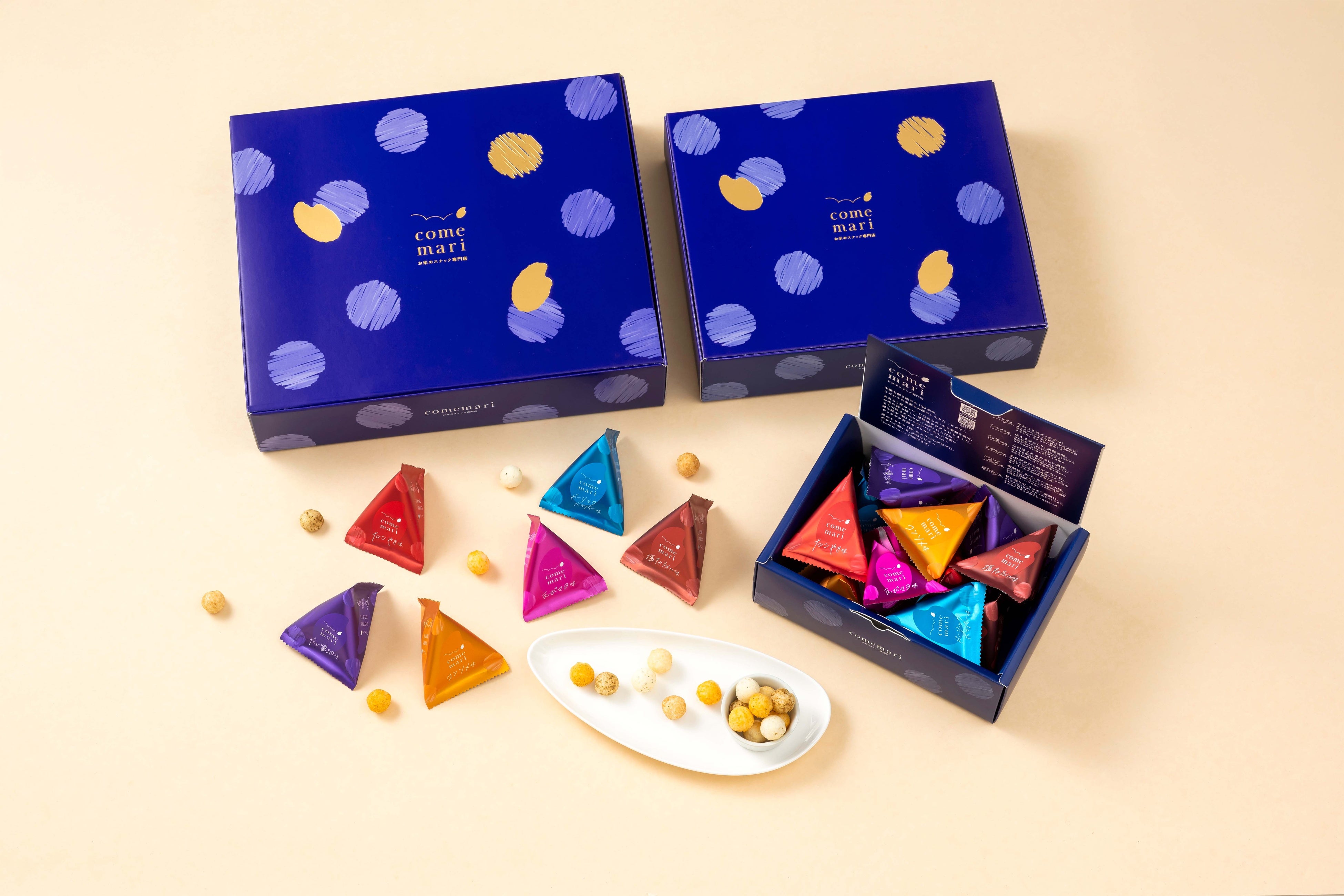 国産うるち米を100%使用した、軽やかでサックサクの食感に、コロコロと転がる“鞠”を思わせる、見た目にも愛らしい小粒なサイズ感。選ぶ時間まで楽しくなるフレーバーラインナップや、気分を明るく彩るカラフルなパッケージにも、comemariならではのこだわりを込めました。