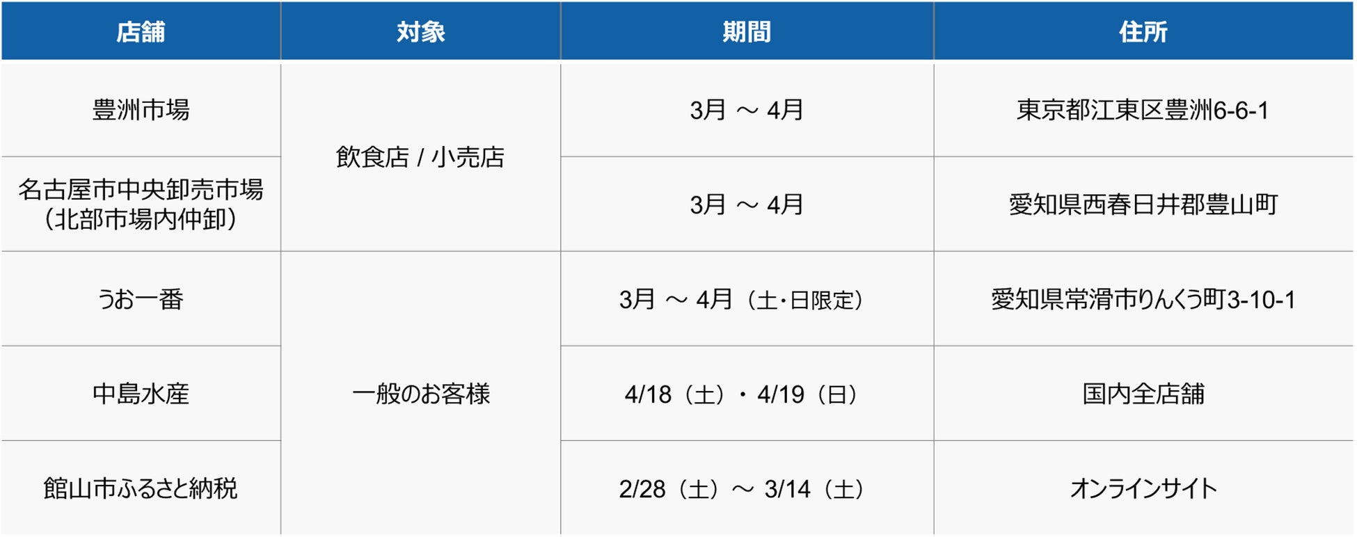 さらに、YouTuber・きまぐれクック氏が手がける複合型海鮮テーマパーク「うお一番」、日本屈指の鮮魚専門店「中島水産」、千葉県安房地域の一部飲食店においても販売予定です。あわせて、地域産業の活性化に向けた新たな取り組みとして、館山市のふるさと納税返礼品にも期間限定で出品いたします。