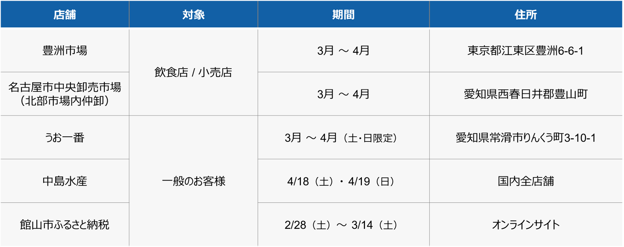 さらに、YouTuber・きまぐれクック氏が手がける複合型海鮮テーマパーク「うお一番」、日本屈指の鮮魚専門店「中島水産」、千葉県安房地域の一部飲食店においても販売予定です。あわせて、地域産業の活性化に向けた新たな取り組みとして、館山市のふるさと納税返礼品にも期間限定で出品いたします。