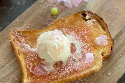 苺のマーブルグリークヨーグルトに苺、桜あん、ホワイトチョコのトッピング。花びら入り桜風味のはちみつをかけて、淡い桜色のスミツンに仕上げました。一足早く春を感じられる一品です。