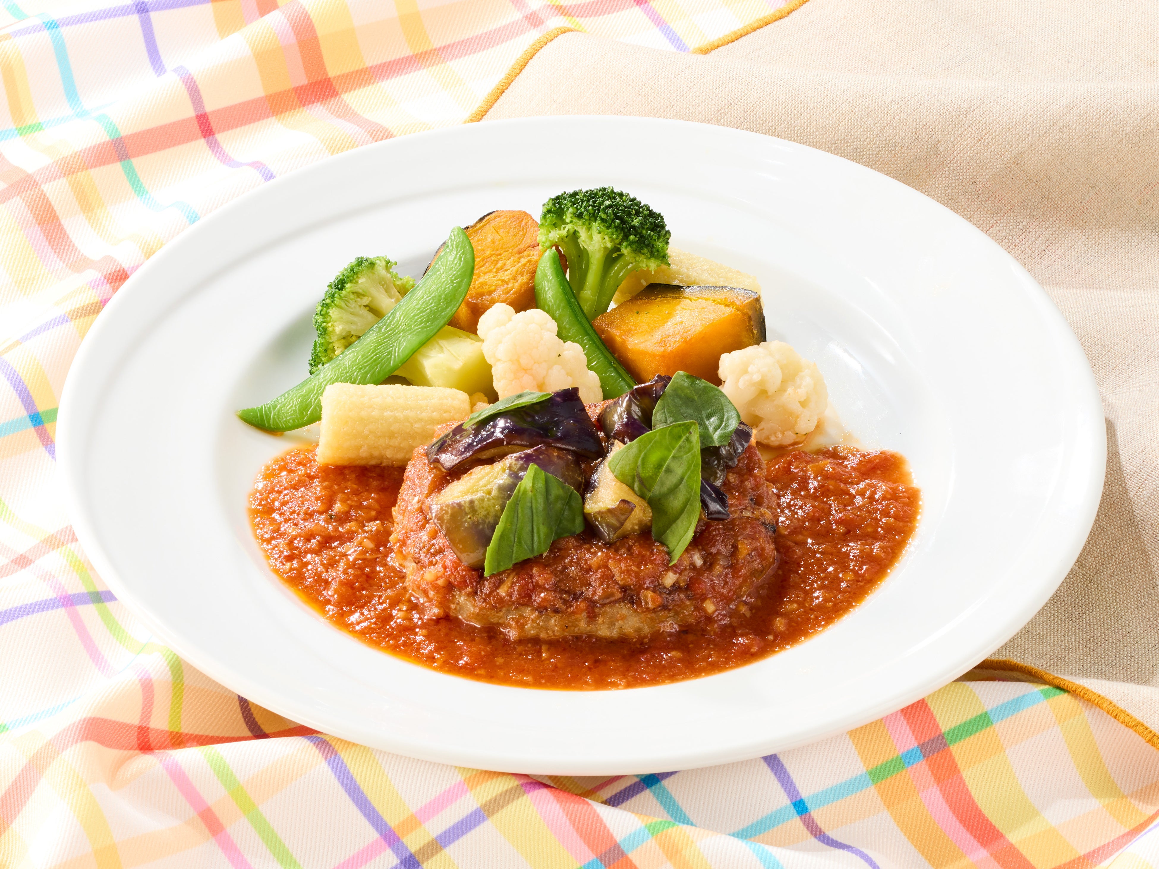 ガーリックが効いたたっぷりのトマトソースが食欲をそそる、ジューシーなハンバーグです。玉ねぎの旨みが溶け込んだ酸味と甘みのバランスが絶妙なトマトソースは、とろけるような食感の揚げなすや温野菜とも相性抜群。爽やかな香りのフレッシュバジルが風味にアクセントを加えます。