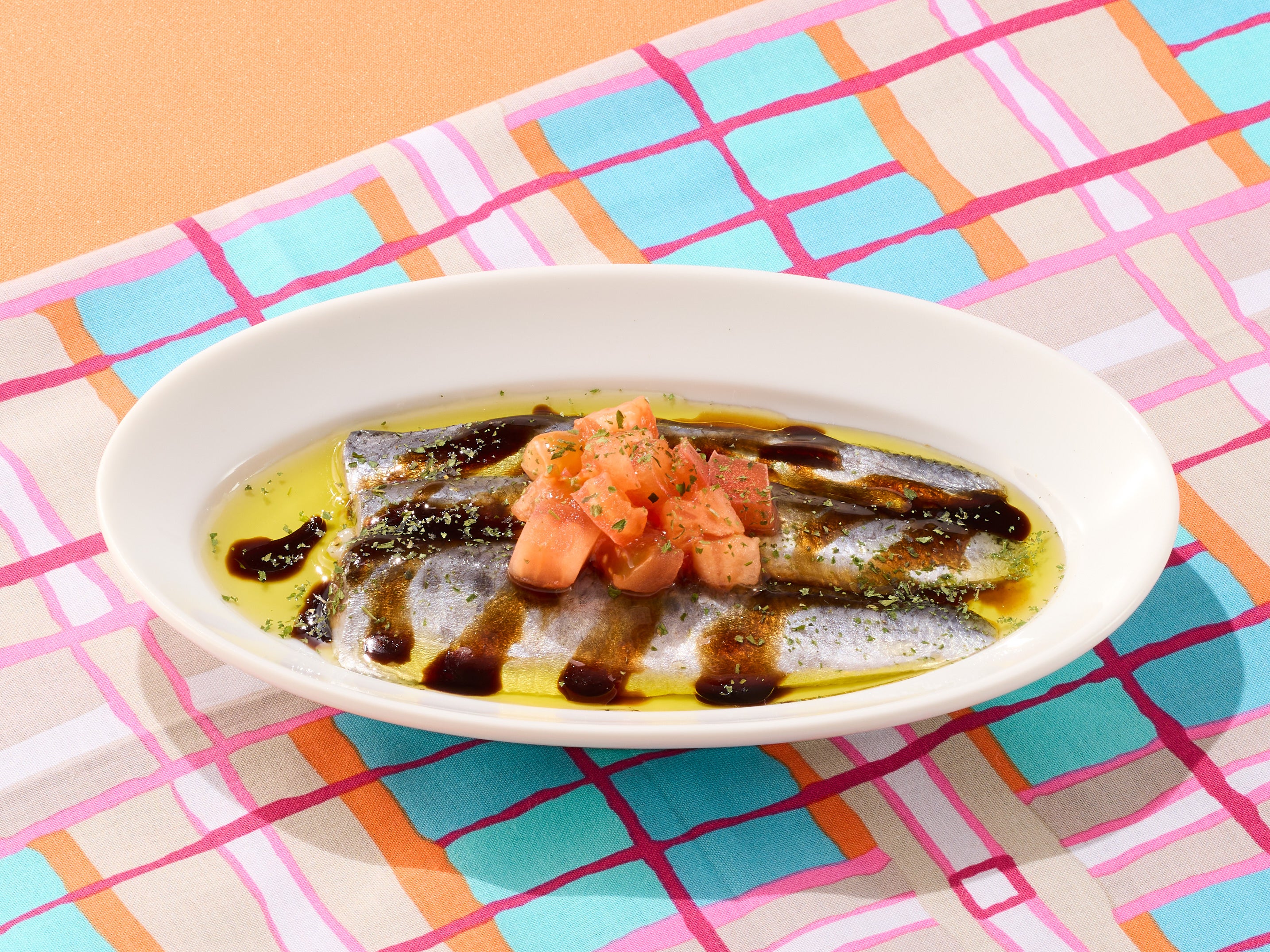 脂がのった酢締めの真いわしに、オリーブオイルとバルサミコソースを合わせた一品です。バルサミコソースの芳醇な香りと程よい酸味が、真いわしの旨みを引き立てます。
