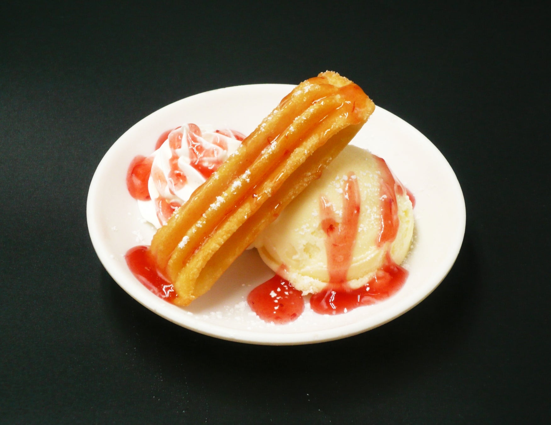◆揚げたてイチゴチュロ:揚げたてのアツアツカスタードチュロにホイップと
