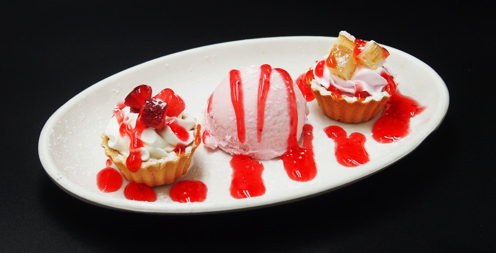 ◆イチゴのスイーツプレート:2種のプチタルトとイチゴアイスを盛りつけました。