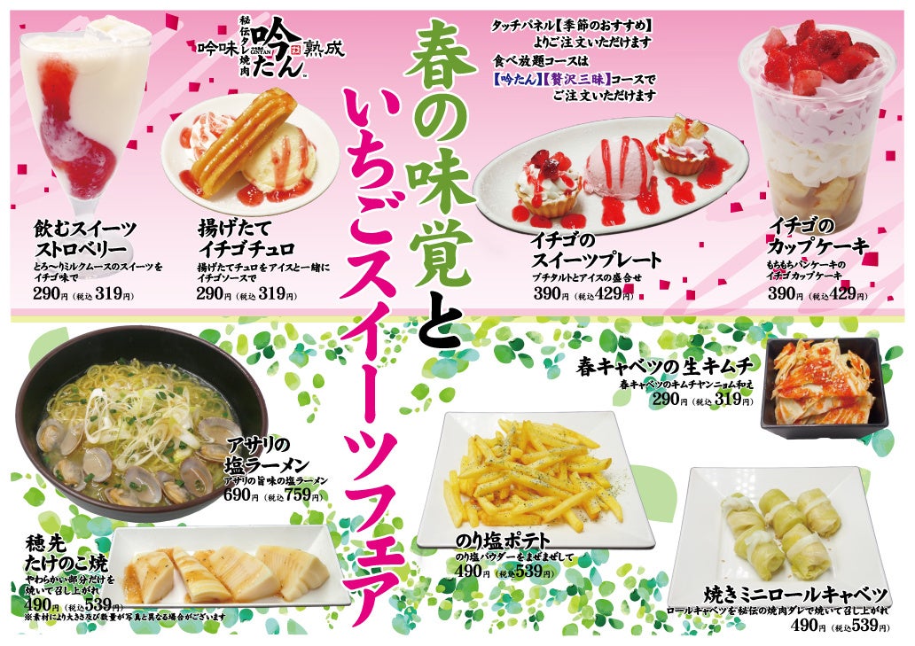 愛知県にて飲食店を展開する株式会社プレジャー(本社:愛知県尾張旭市、代表:小山和紀)が運営する、愛知県瀬戸市【秘伝タレ焼肉 吟味熟成 吟たん瀬戸店】は2026年3月7日(土)より、【春の味覚といちごスイーツフェア】と題しまして春限定メニューの販売を開始いたします。