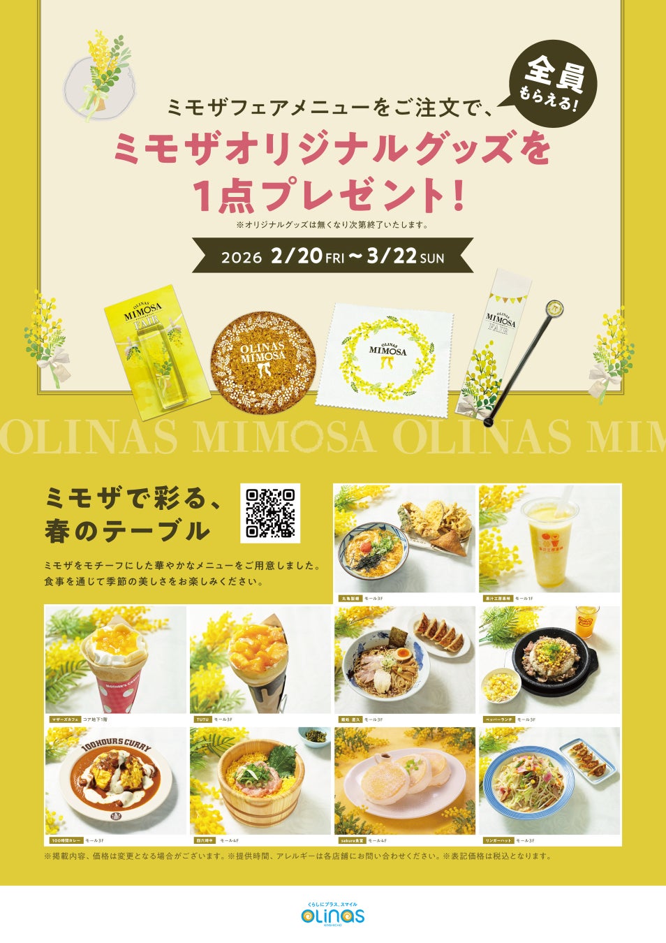 さらに期間中は、対象メニュー1注文につきオリジナルグッズがもらえる「ミモザチケット」を配布。開業20周年の感謝を込め、食を通じて春の賑わいを創出します。