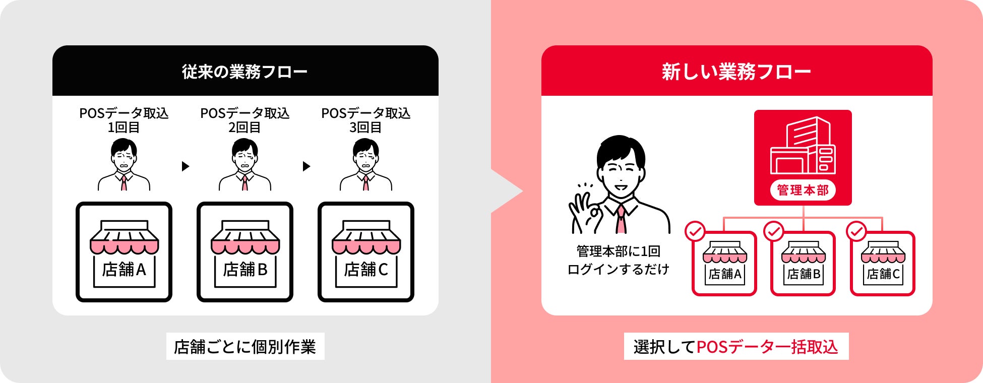 店舗ごとの個別作業を不要にし、管理工数を大幅に削減