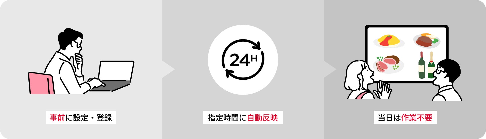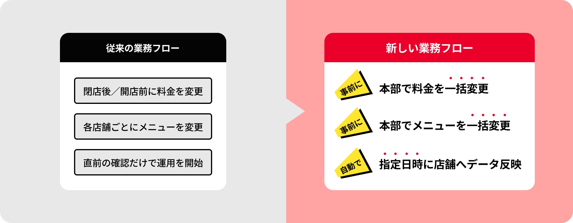 これまで店舗ごとに実施していたメニュー作成やスケジュール設定、商品取込といった業務を本部側で集約。事前準備を前提とした運用を可能にします。