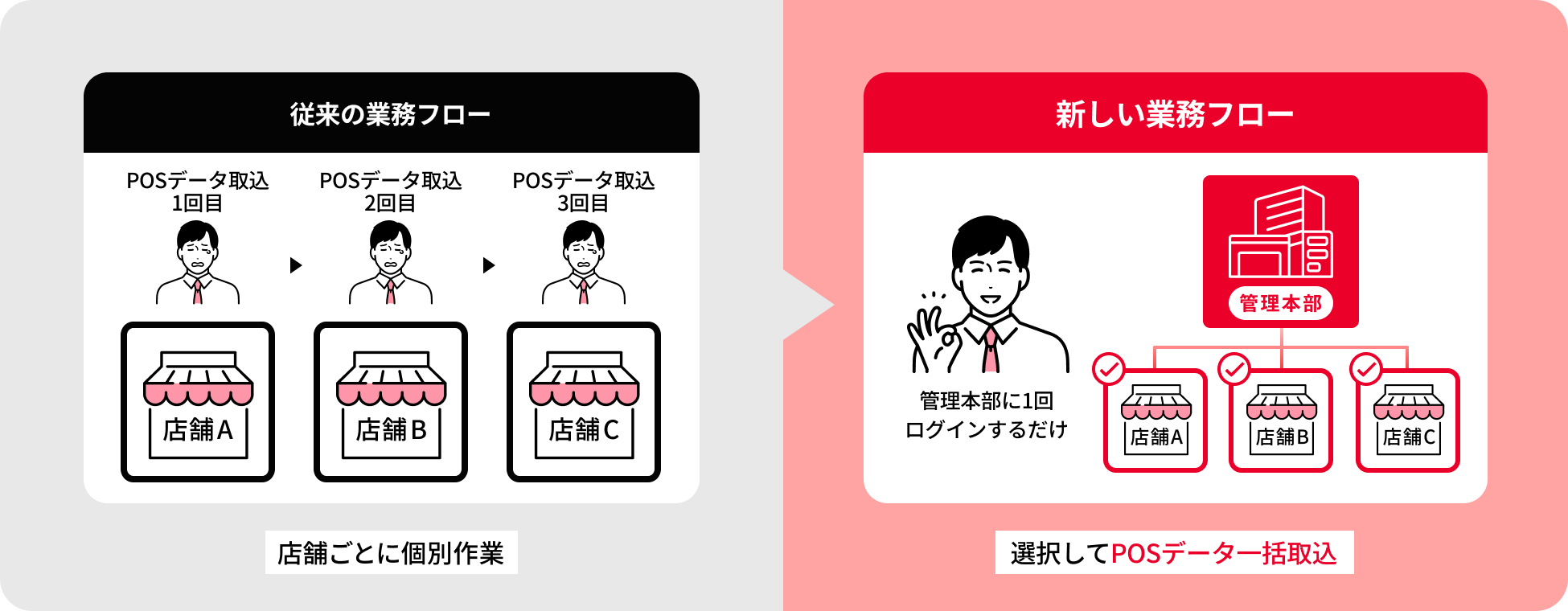 店舗ごとの個別作業を不要にし、管理工数を大幅に削減
