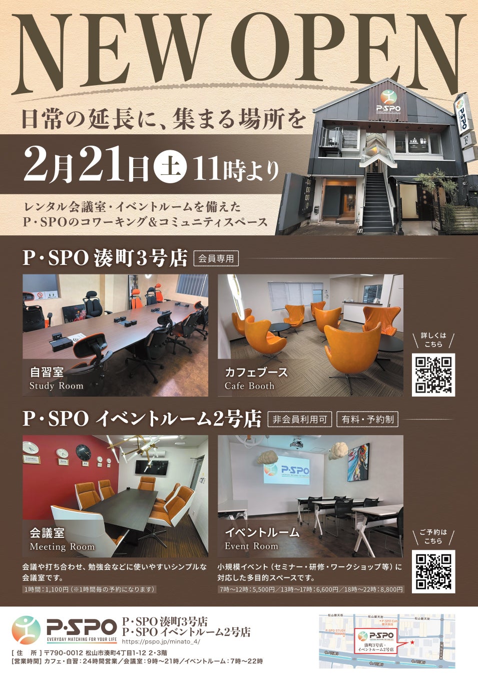株式会社三福ホールディングス(本社:愛媛県松山市)が運営するフィットネスブランド「P・SPO(ピースポ)」は、2026年2月21日(土)11時、松山市湊町4丁目に「P・SPO湊町3号店」と「P・SPOイベントルーム2号店」を同時オープンします。