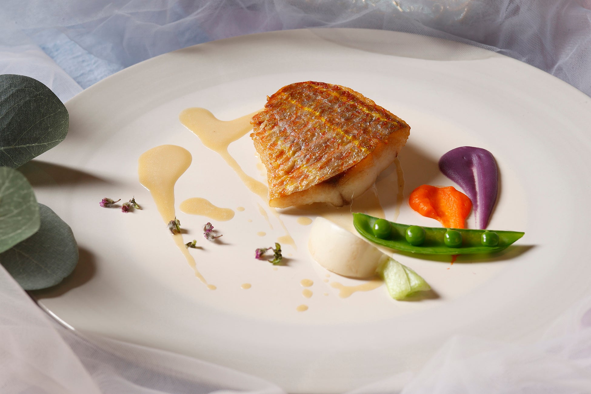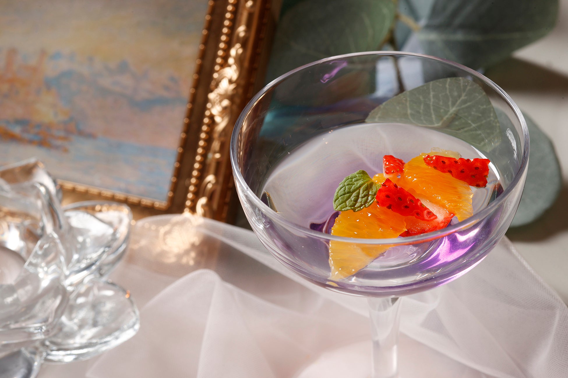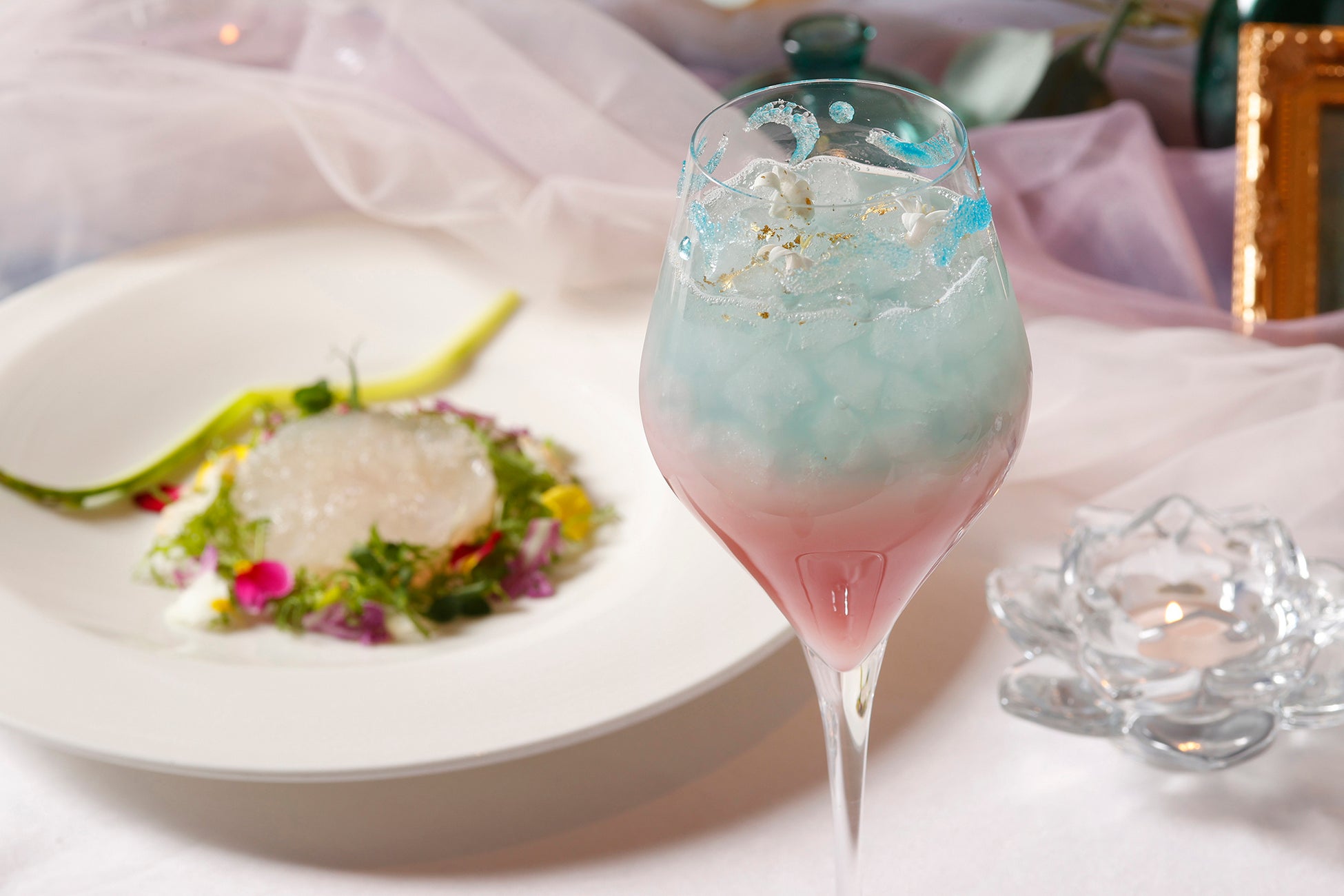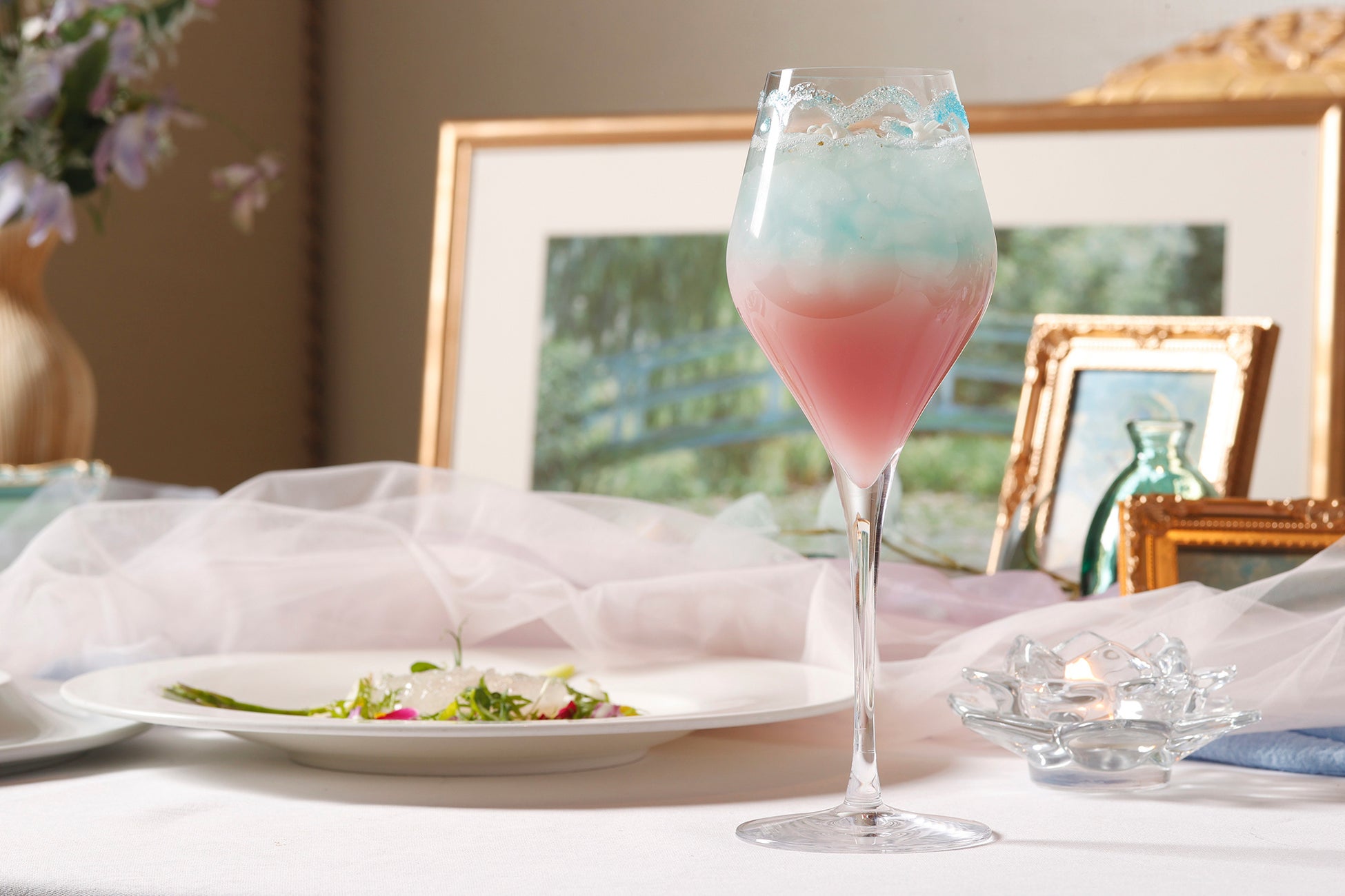 乾杯酒は、南仏アンティーブに佇む城塞を思わせるカクテルでモネの世界へ誘います。コースは、モネの代表作「睡蓮」の色彩に重ね仕立てた、ラ・プロヴァンスを象徴するパレット・アート・オードブルでスタート。前菜は、旬を迎えた桜鯛のマリネとトマトのジュレを重ね、「日傘をさす女性」に漂う軽やかな光と春風の情景を描きました。温前菜は、モネが愛した南仏発祥の郷土料理のブイヤベースを、魚料理は季節の鮮魚をムニエルに仕立て、印象派作品の舞台としても知られるノルマンディー地方に着想を得たソースを添えてお届けします。