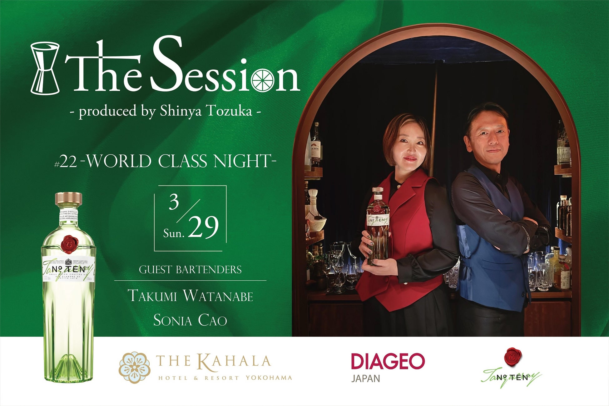 「The Session」は、国内外で高い評価を受けるトップバーテンダーを迎え、その技と感性を体験いただく特別な日として開催してきたシリーズイベントです。第22弾となる今回は、世界的レジェンドバーテンダー 渡邉 匠氏と、BAR業界最大手でマーケティングクリエイターとしても活躍するバーテンダー ソニア・カオ氏、2人のメインキャストでお迎えいたします。奈良県桜井市を拠点に活動する渡邉氏は、2010年に世界最大級のカクテルコンペティション「Diageo World Class 2010」日本予選で優勝し、世界大会に出場。世界大会では部門優勝を果たすなど、その卓越した技術と表現力は国際的にも高く評価されています。自身の名を冠したカクテル「Takumi’s Aviation」は、世界的なカクテルブックにも掲載され、奈良県をカクテル観光の目的地へと押し上げた存在として知られています。一方、ソニア・カオ氏は、デジタルマーケティングのバックグラウンドを持ちながら、バーテンダー、フォトグラファー、クリエイティブディレクターとして多方面で活躍するハイブリッドなクリエイター。近年では「Diageo World Class 2025」において日本国内ファイナリスト10名に選出されるなど、その感性と表現力が注目を集め、中国茶を用いた独創的なカクテルは、大きな話題となりました。当日は、ディアジオ ジャパン株式会社の「タンカレー ナンバーテン」をベースに、それぞれの個性が際立つオリジナルカクテルをご提供。世界の舞台で磨かれた技と感性が交差する、1日限りの特別な体験をお届けいたします。