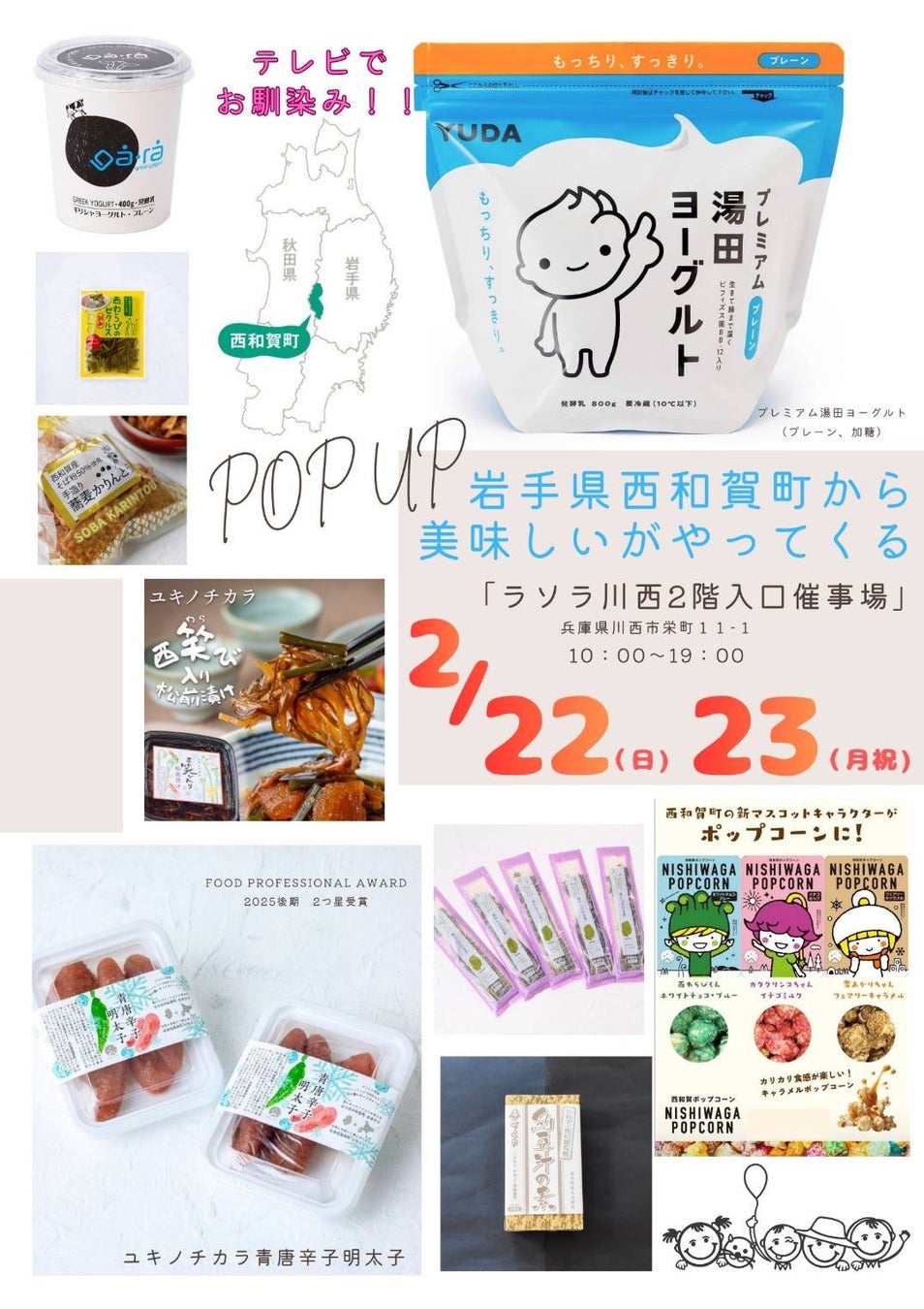株式会社西和賀産業公社(岩手県西和賀町)は、町の特産品を販売する物産イベント「西和賀フェア」を、2026年2月22日(日)・23日(月・祝)の2日間、兵庫県川西市の商業施設「ラソラ川西」にて開催します。本イベントは昨年2月に初出展し好評を得たことから、今年も継続開催するものです。