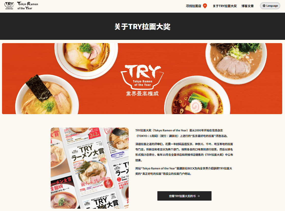 講談社が発行する、26年の歴史と権威を誇るラーメン専門誌『TRYラーメン大賞』の公式ウェブサイト「Tokyo Ramen of the Year」( https://tokyoramenoftheyear.com/ )は、2025年12月17日の本格公開後のアップデート第1弾として、英語版および中国語(簡体字)版を公開し、多言語対応を開始いたしました。