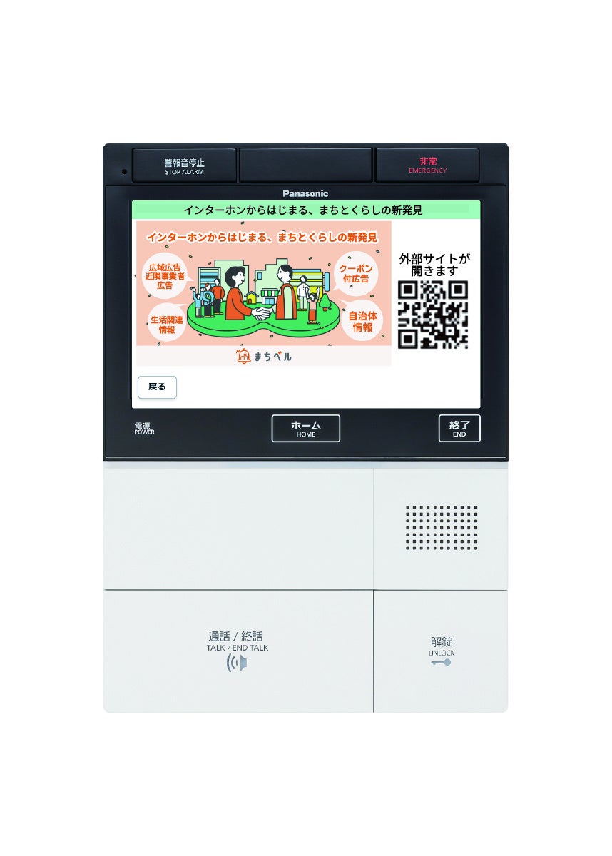 「まちベル」は、パナソニックが展開する、インターホンを活用したマンション住民向け情報配信サービスです。 居住者の生活導線上にあるインターホン端末を「地域や暮らしに役立つ情報との接点」として活用し、マンション周辺の店舗情報や生活関連情報、自治体からのお知らせなどをダイレクトに届けます。スマートフォンのアプリ等と異なり起動の手間がなく、手軽に情報を確認できるのが特徴です。