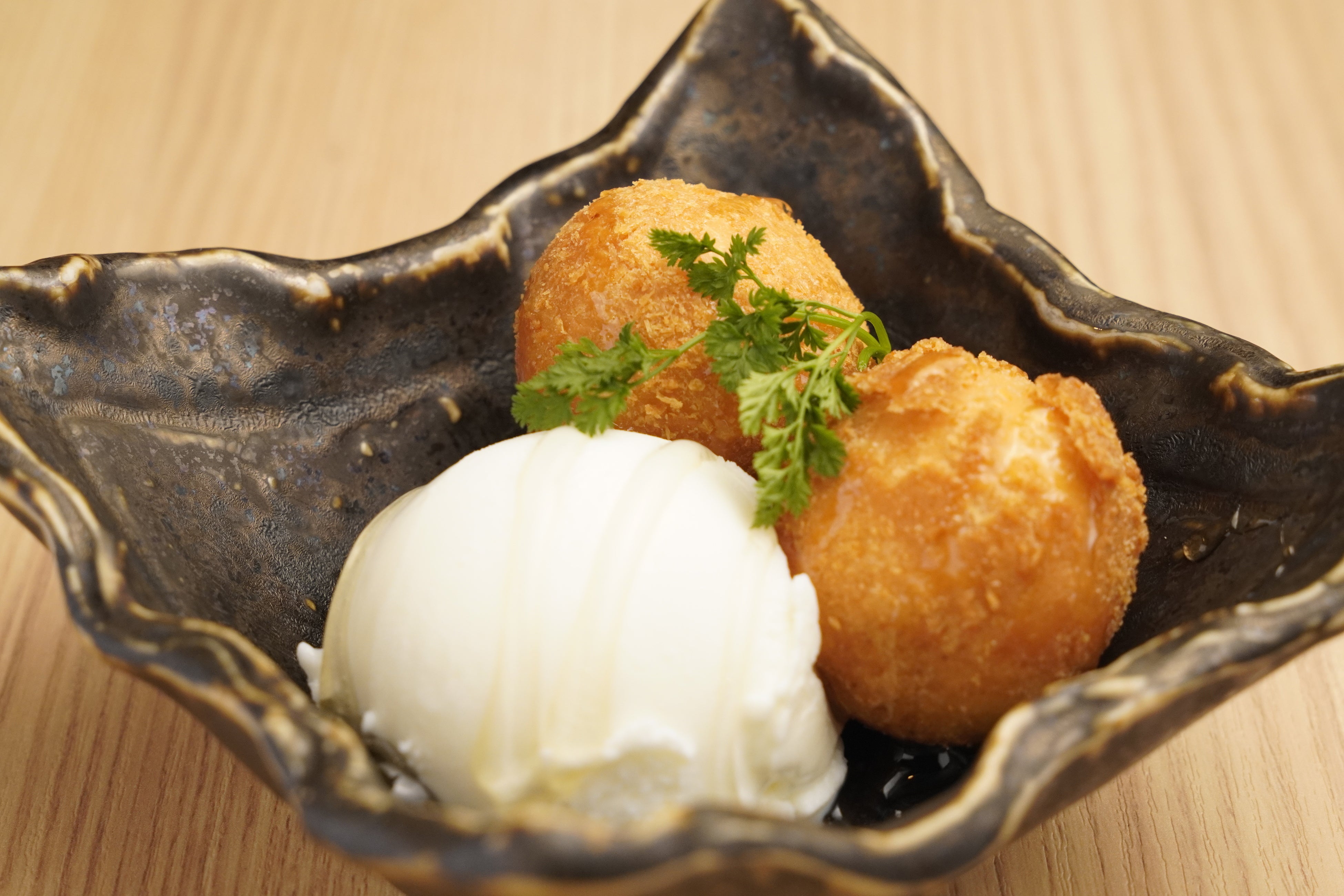 北海道ミルクアイスのやさしい甘みと、揚げたてチーズボールの塩味。仕上げにかけるハチミツが全体をまとめます。