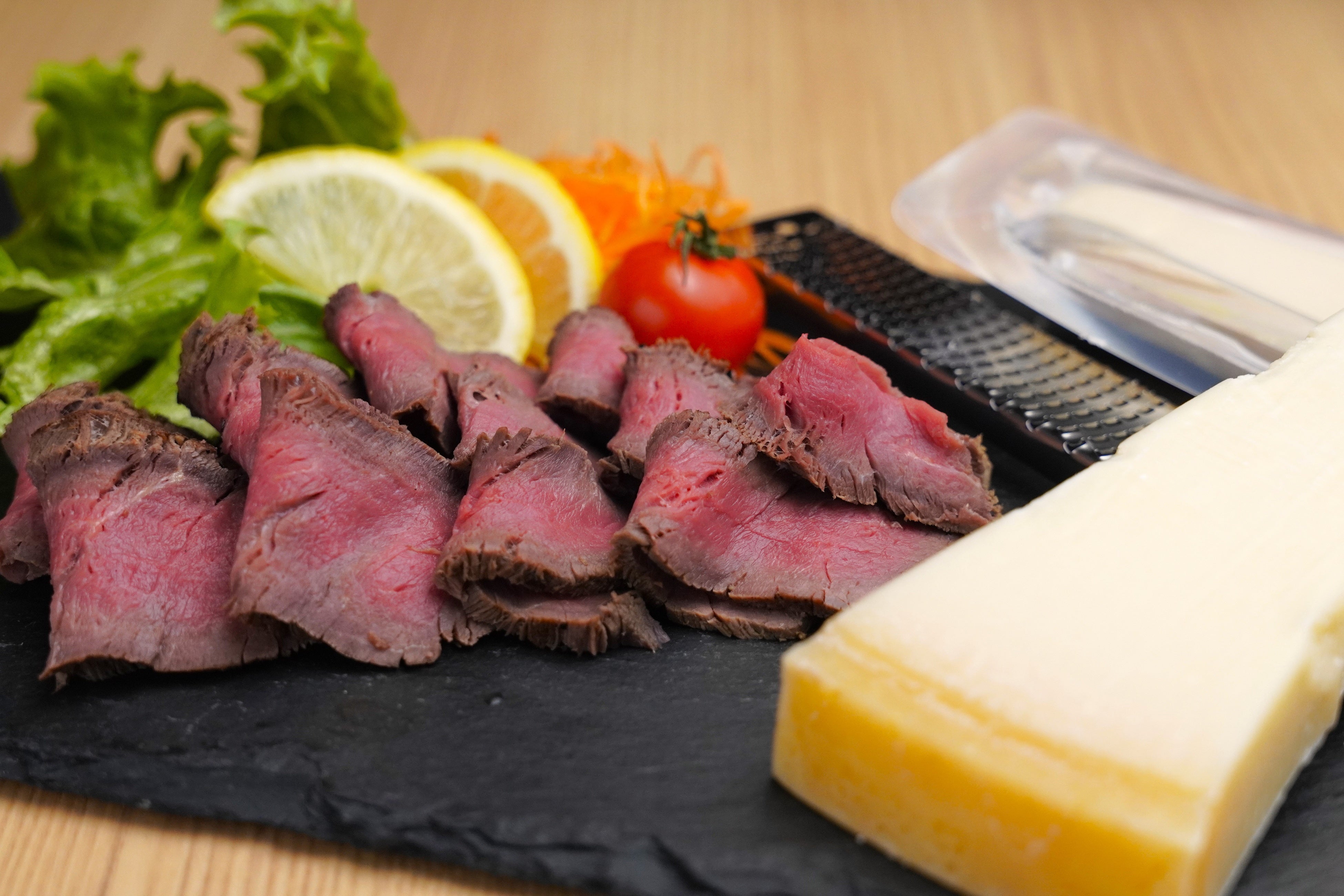 しっとりと火入れしたローストホースに、テーブルでチーズを削りかける一皿。ふわりと舞い落ちる削りたてチーズの香りが、赤身の旨みを引き立てます。脂の軽い馬肉だからこそ、チーズのコクが重くなりすぎない。上質さとライブ感を両立させた主役メニューです。