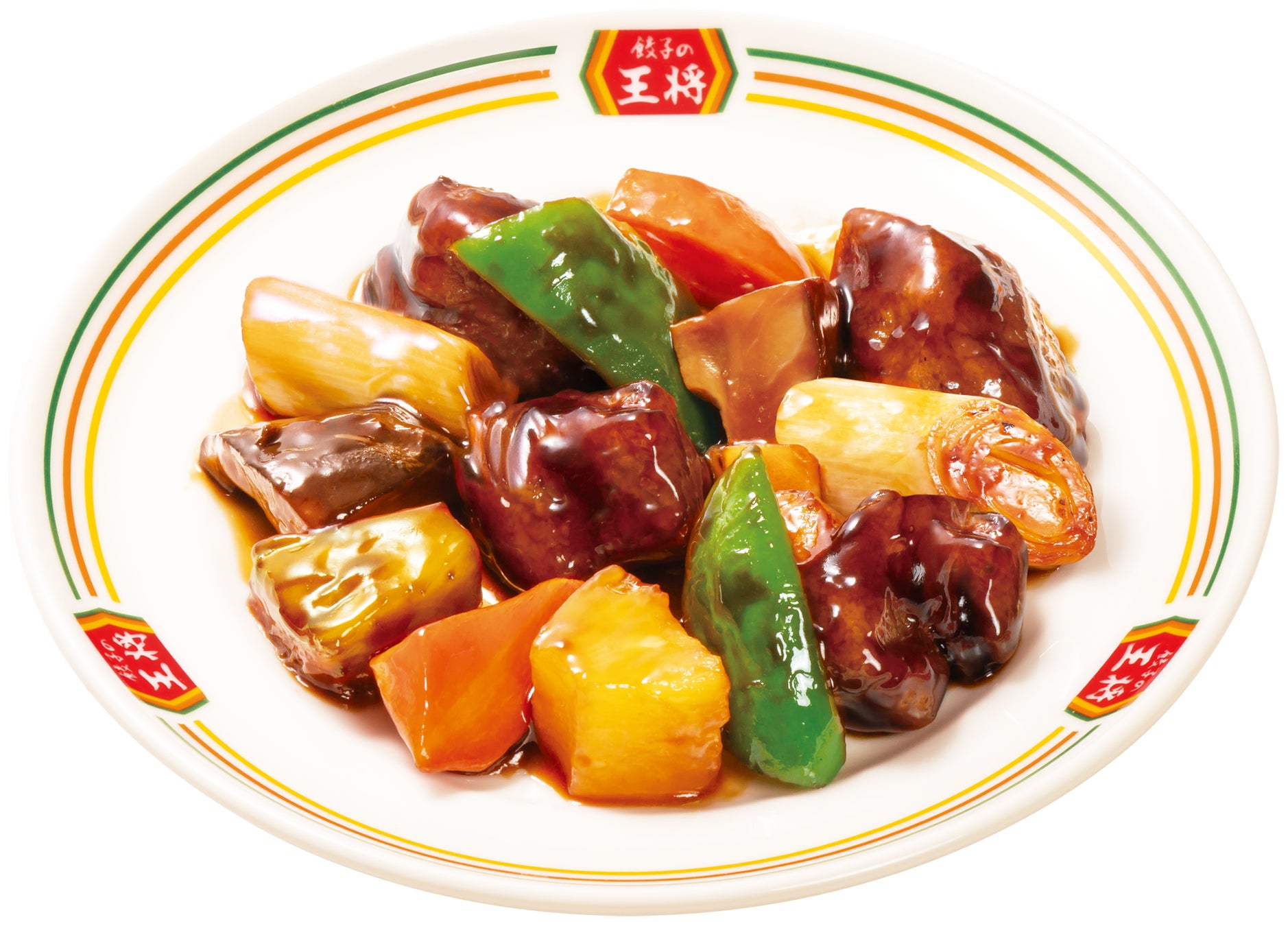 黒酢や鎮江香酢、中国醤油などをブレンドしたマイルドで奥深い味わい。ジューシーな豚肉にシイタケ、長ネギ、ピーマン、ニンジン、パイナップルと、彩りも食感も豊かな一品。