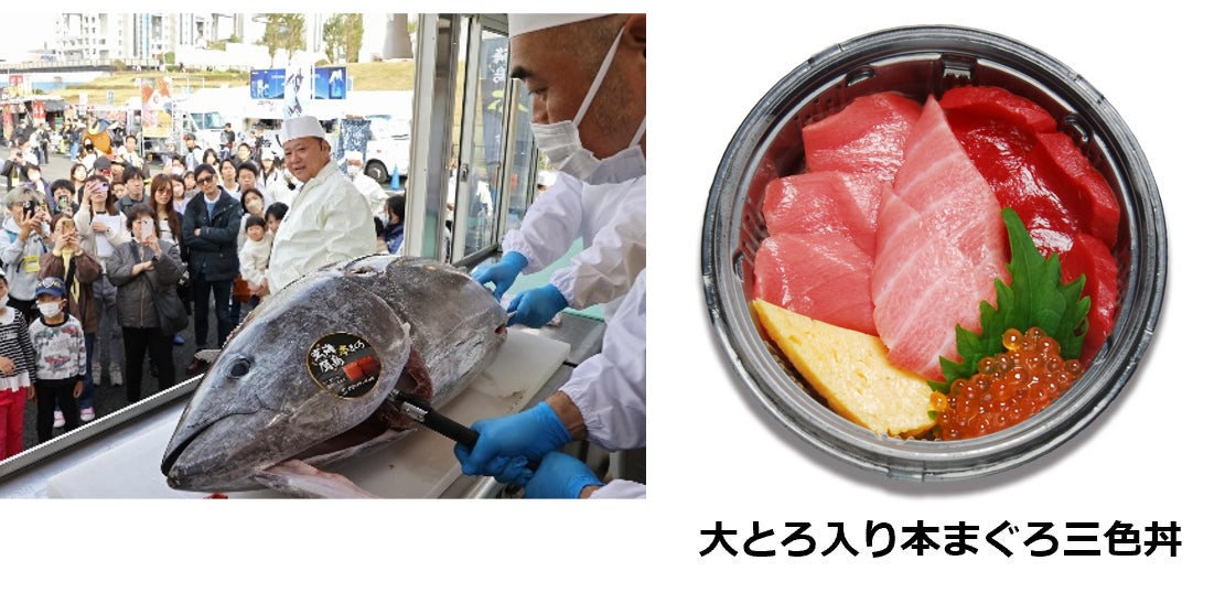 魚のプロの「豊洲かんぺい会」ブースでは、玄界灘の長崎・鷹島で育てられた「生本マグロ」を厳選して直送し、来場者の目の前で「解体ショー」を毎日開催します。さばいたばかりの超新鮮なマグロの味わいは格別です。赤身、中トロ、大トロを食べ比べられる「大とろ入り本まぐろ三色丼」などを提供します。