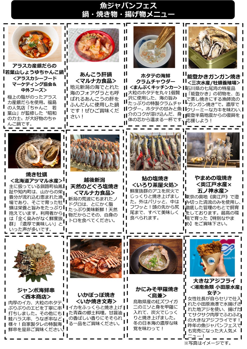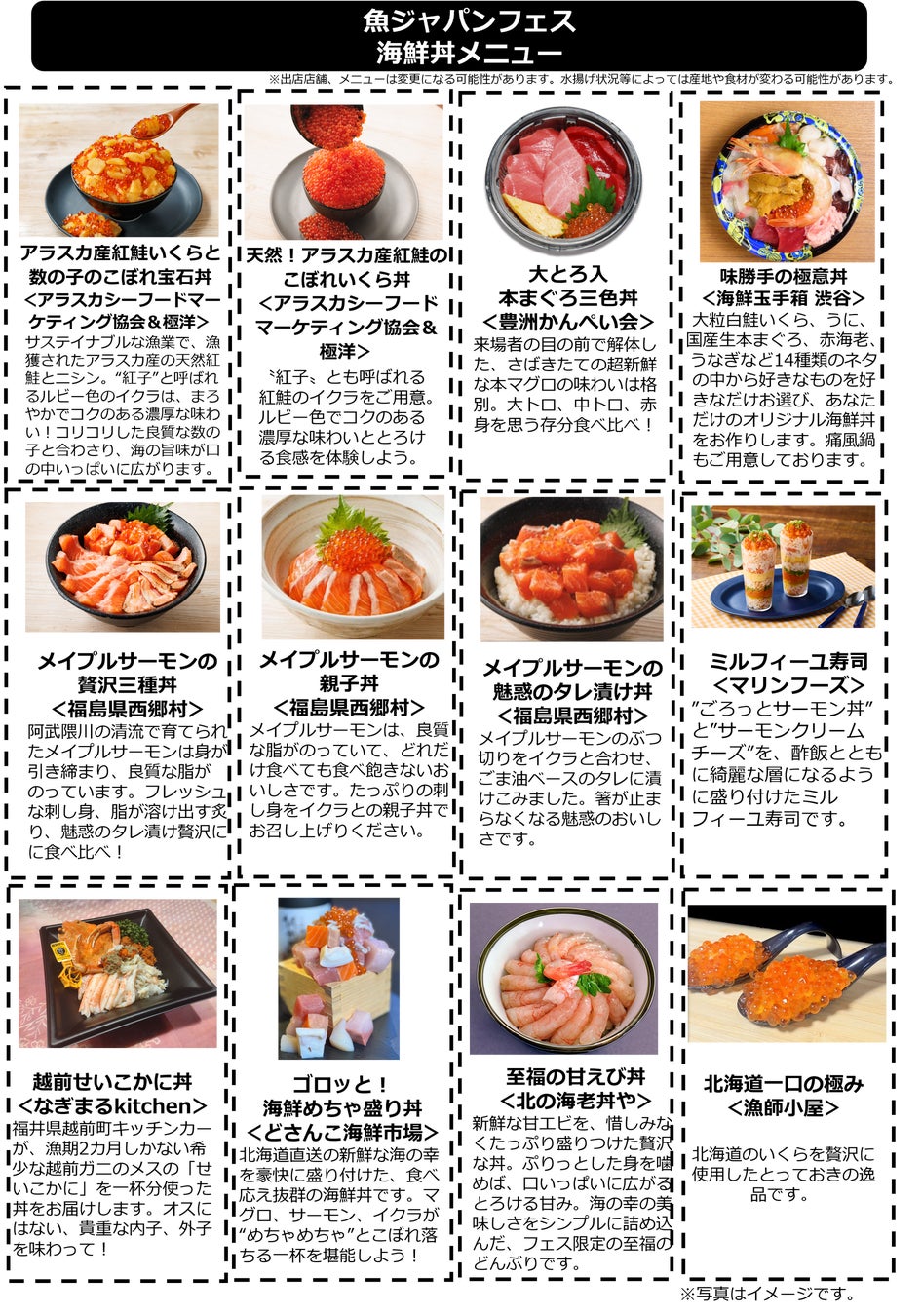 サーモンのピザや銀だらのちゃんこ鍋、サバラーメン、14種類の中から好みの魚介を選べる海鮮丼などなど、新メニューや初出店が続々と登場します。