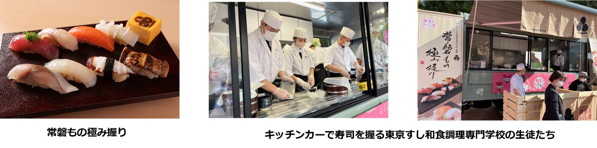 「東京すし和食調理専門学校」が大型キッチンカーで出店し、未来の職人を目指す生徒たちが、来場者の目の前で丁寧に心を込めて握った寿司を提供します。同校は和食に特化した唯一の認可専門学校。70%が実習というカリキュラムで磨いた技を披露。肉厚のヒラメなど、常磐沖で水揚げされた、この時期が旬の魚を中心に全部で8貫が楽しめます。