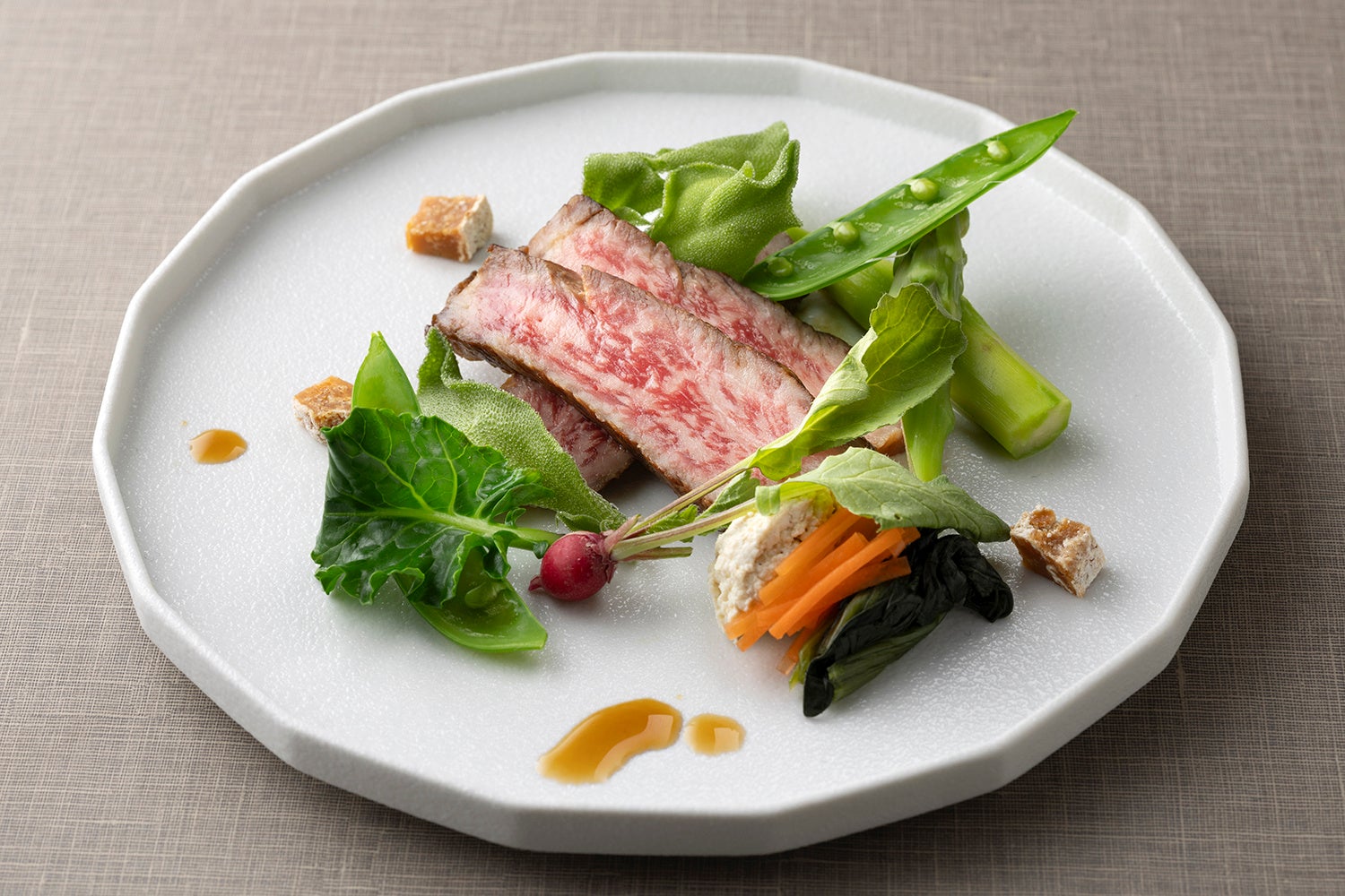 今春は、奈良県が誇る和牛「大和牛」をはじめ、シェフが奈良県の生産者を訪問し、作り手の姿勢に触れて感銘を受け、選び抜いた食材を中心にコース料理を構成いたしました。吉野晒(よしのざらし)の製法を150年以上守り続ける天極堂の吉野本葛のほか、江戸時代から天日干しの製法を受け継ぐ嘉兵衛本舗の番茶、奈良県産大豆にこだわり、在来種の豆「大鉄砲大豆」を復刻して作った豆腐や醤油、奈良県の柿を多様な加工品に仕立てる「柿の専門」の柿酢など、生産者の思いが伝わる食材を取り入れております。