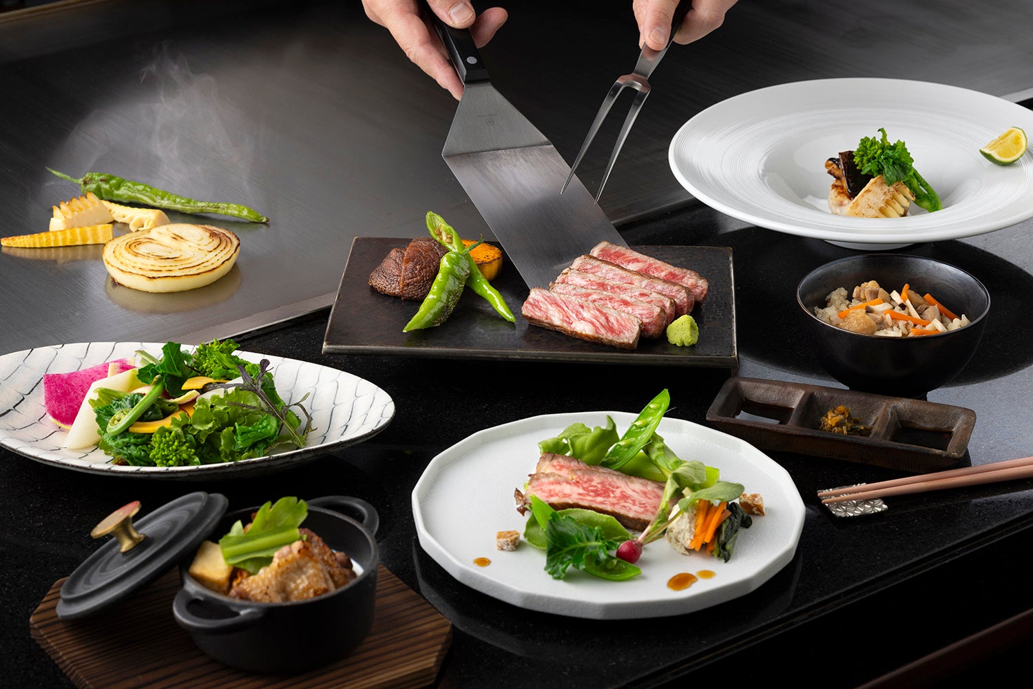 大和牛、大和肉鶏、大鉄砲大豆など、味わい豊かな食材の取り合わせ。期間:2026年3月1日(日)~5月31日(日)、場所:ホテル19階 鉄板焼き 一花一葉
