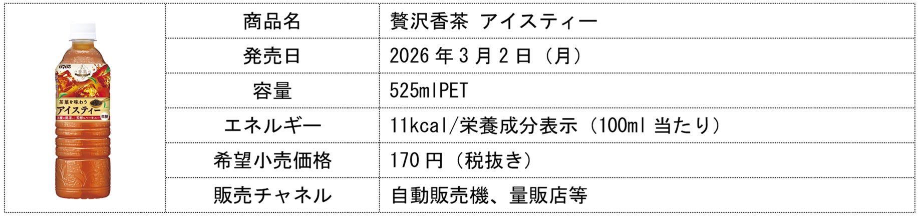 ダイドードリンコ株式会社(本社:大阪市北区、代表取締役社長:中島 孝徳)は、2026年春夏の新商品として、「贅沢香茶 アイスティー」を3月2日(月)より発売しますので、お知らせいたします。