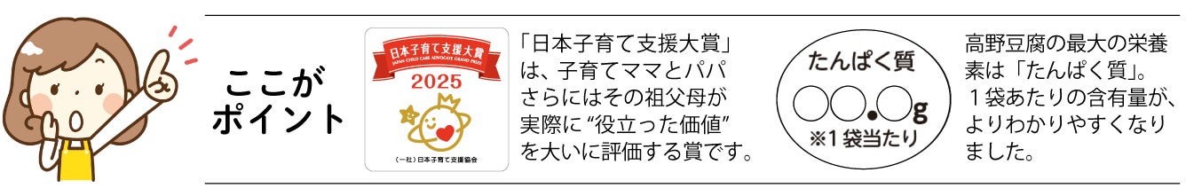 子どもの成長に欠かせない栄養素を豊富に含む高野豆腐を、子育てファミリーはもちろん、健康的な食生活を目指す方々により広く認知していただけるよう、パッケージをリニューアルいたしました。