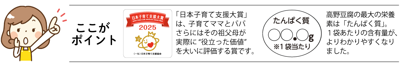 子どもの成長に欠かせない栄養素を豊富に含む高野豆腐を、子育てファミリーはもちろん、健康的な食生活を目指す方々により広く認知していただけるよう、パッケージをリニューアルいたしました。