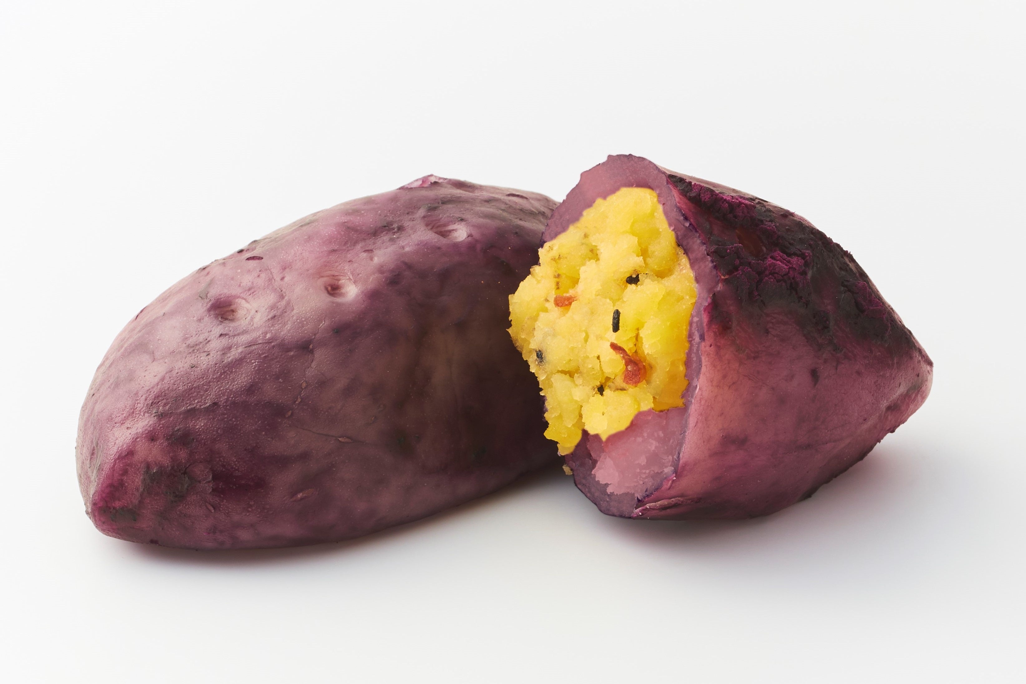 鮮やかな紫色に黒ごま、でこぼことした見た目でさつまいもそっくりに仕上げています。