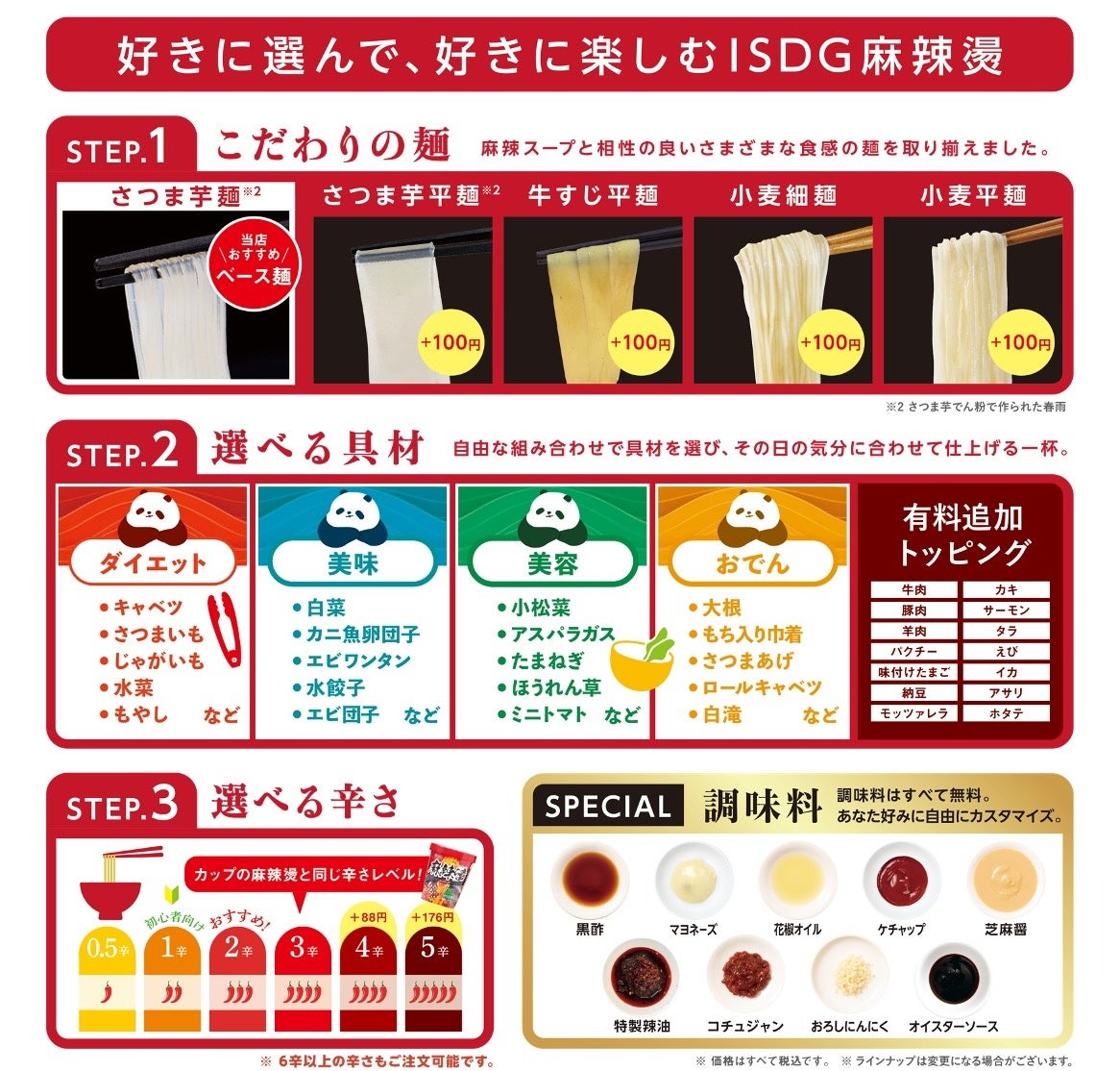 「ISDG麻辣燙」麻辣燙の世界を、もっと自由に楽しんでいただくために、お好みの具材・薬味を自由に選び「あなただけの麻辣燙」が本場の味わいでお楽しみいただけます。