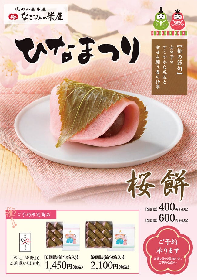 なごみの米屋では、春の和菓子の定番、桜葉が香る「桜餅」のご予約を承ります。