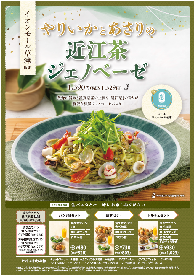 ◆提供店舗:鎌倉パスタ イオンモール草津店 ※パン食べ放題セットなど、通常のセットメニューとも組み合わせてお楽しみいただけます 。