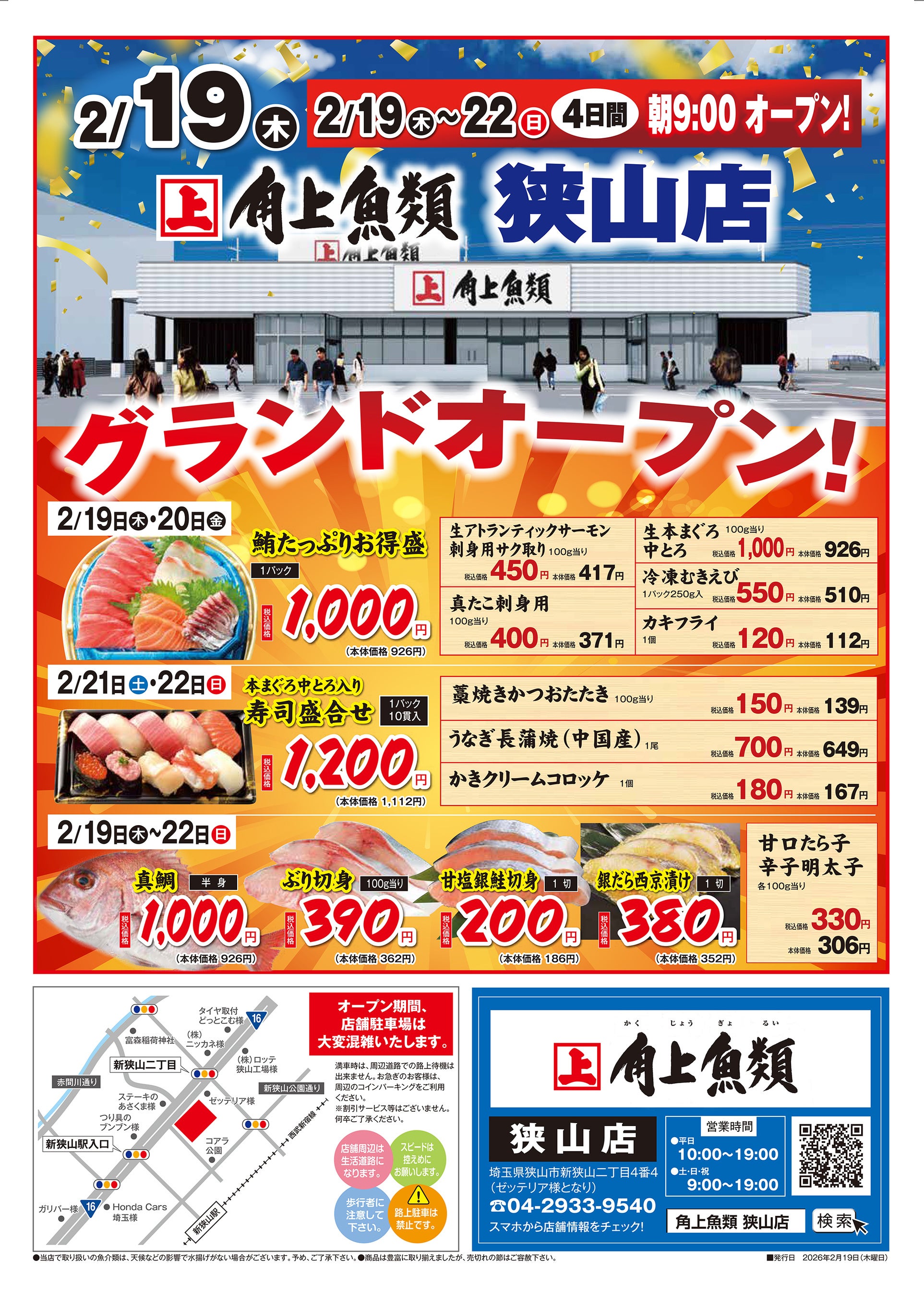 角上魚類ホールディングス株式会社(本社:新潟県長岡市・埼玉県さいたま市、代表取締役社長:柳下 浩三)は、本日2026年2月19日(木)、埼玉県狭山市に「角上魚類 狭山店」を待望のグランドオープンいたしました。