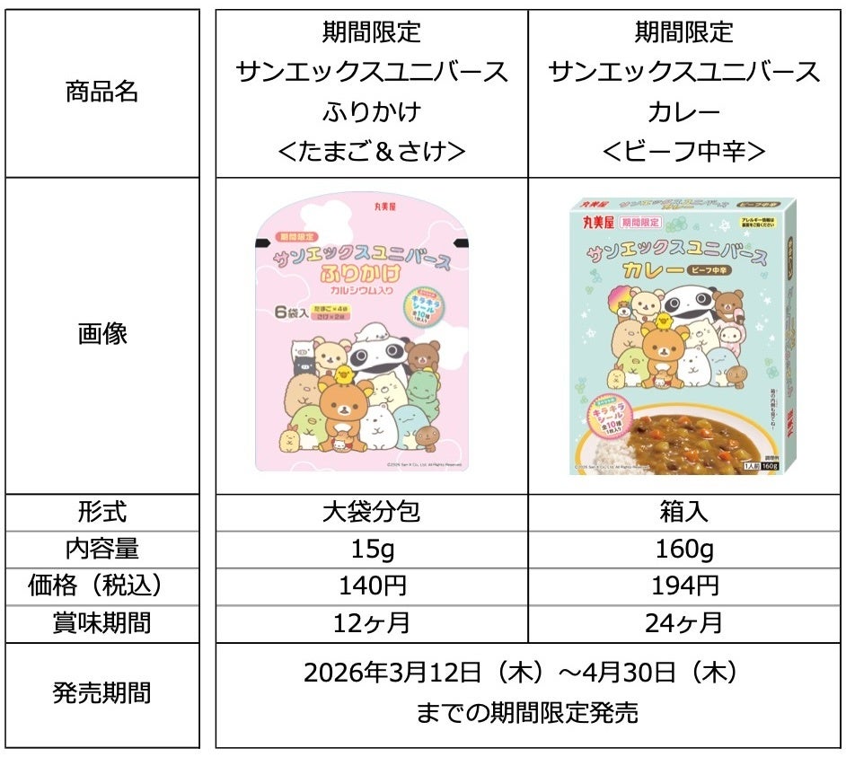 丸美屋食品工業株式会社(本社:東京都杉並区、社長:阿部豊太郎)は、「リラックマ」や「すみっコぐらし」等、幅広い層に人気のキャラクターが集合した、「サンエックスユニバース」を採用した「サンエックスユニバースふりかけ<たまご&さけ>」と「サンエックスユニバースカレー<ビーフ中辛>」を2026年3月12日(木)から4月30日(木)の期間限定で発売いたします。