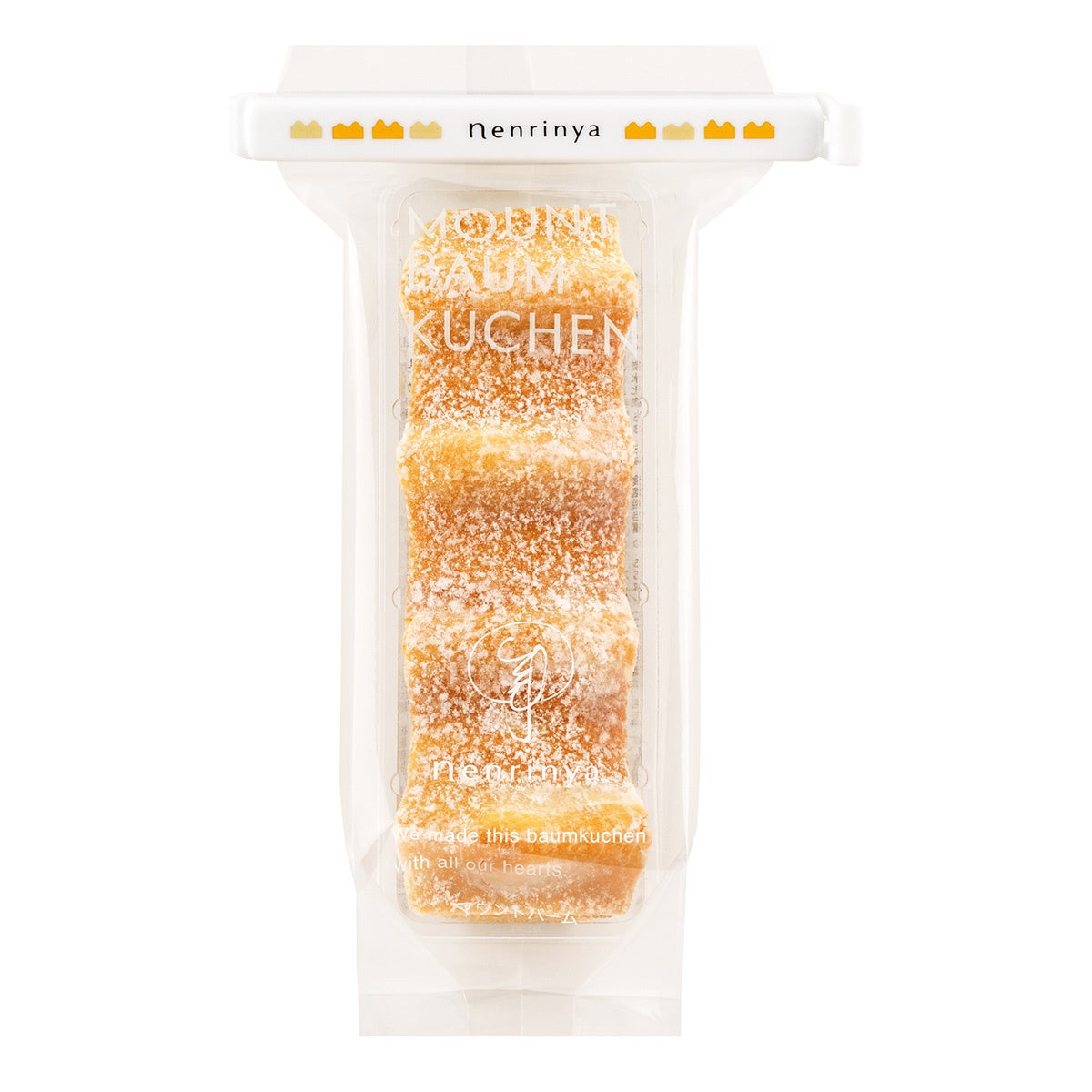 ねんりん家の代表作。皮はカリッ、中はしっとり熟成の『マウントバーム しっかり芽』。濃厚なバター風味の生地を、独自の窯で長時間じっくり焼きあげておいしさを引き出した、こだわりのバームクーヘンです。